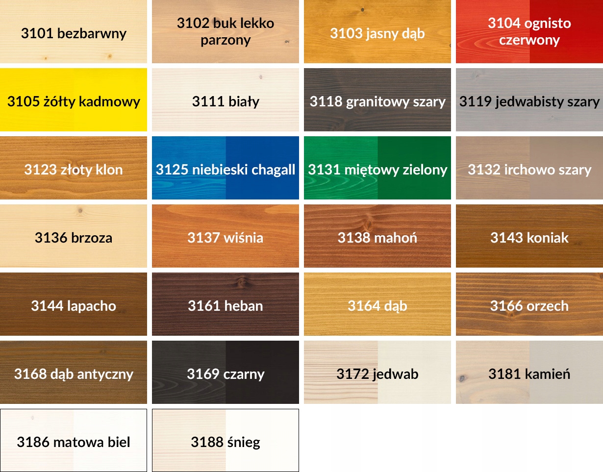 Переважна більшість доступних кольорів створює прозоре покриття, зберігаючи природний малюнок і текстуру деревини. Винятком є інтенсивні кольори (3104, 3105, 3125, 3131, 3132, 3169, 3172, 3181, 3186, 3188), які при дворазовому нанесенні покривають структуру деревини кольором.