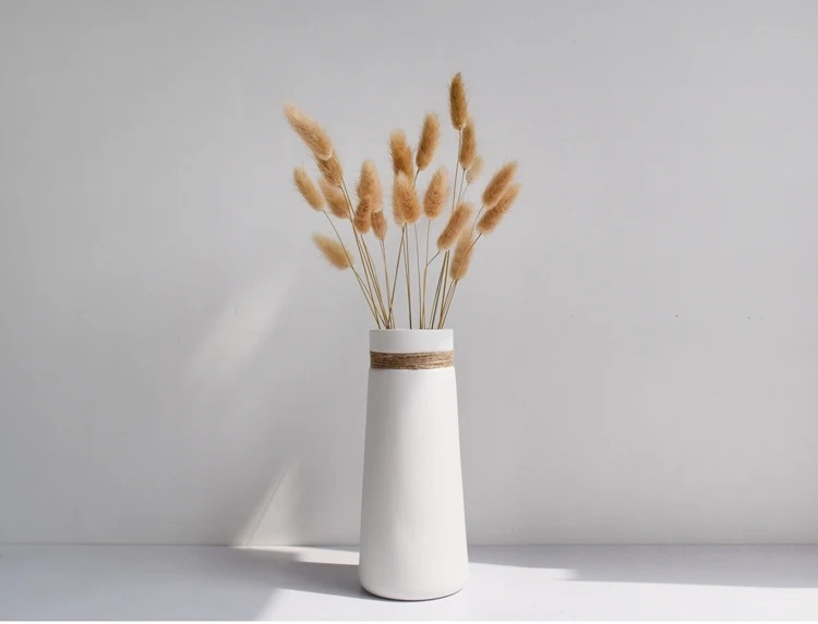 Висока біла ваза для живих і сухих квітів, з джутовою ниткою.