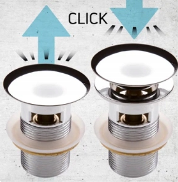 Функціональна пробка клацання. На відміну від пробки з кабелем, він не підключений до акумулятора. Щоб закрити або відкрити стік, просто натисніть пробку пальцем. Легко? Простий як клік-клак! Вибираючи акумулятор із пробкою клацання, не забудьте побачити, чи є у вас раковина з передачею або без передачі та чи ви вибрали правильну пробку.
