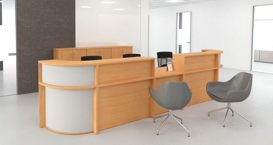 Висока кутова офісна стійка для ресепшн на плитних ніжках. Стільниця і верх надставки виготовлені з дошки товщиною 28 мм, що забезпечує стабільність і комфорт використання. Ніжки з плити 18 мм, фасад з плити HDF 3 мм. Лічильник поставляється в багатьох кольорах. Лицьова сторона завжди сіра. Прилавок має регульовані ніжки до 10 мм, що дозволяє вирівняти прилавок на нерівній підлозі.