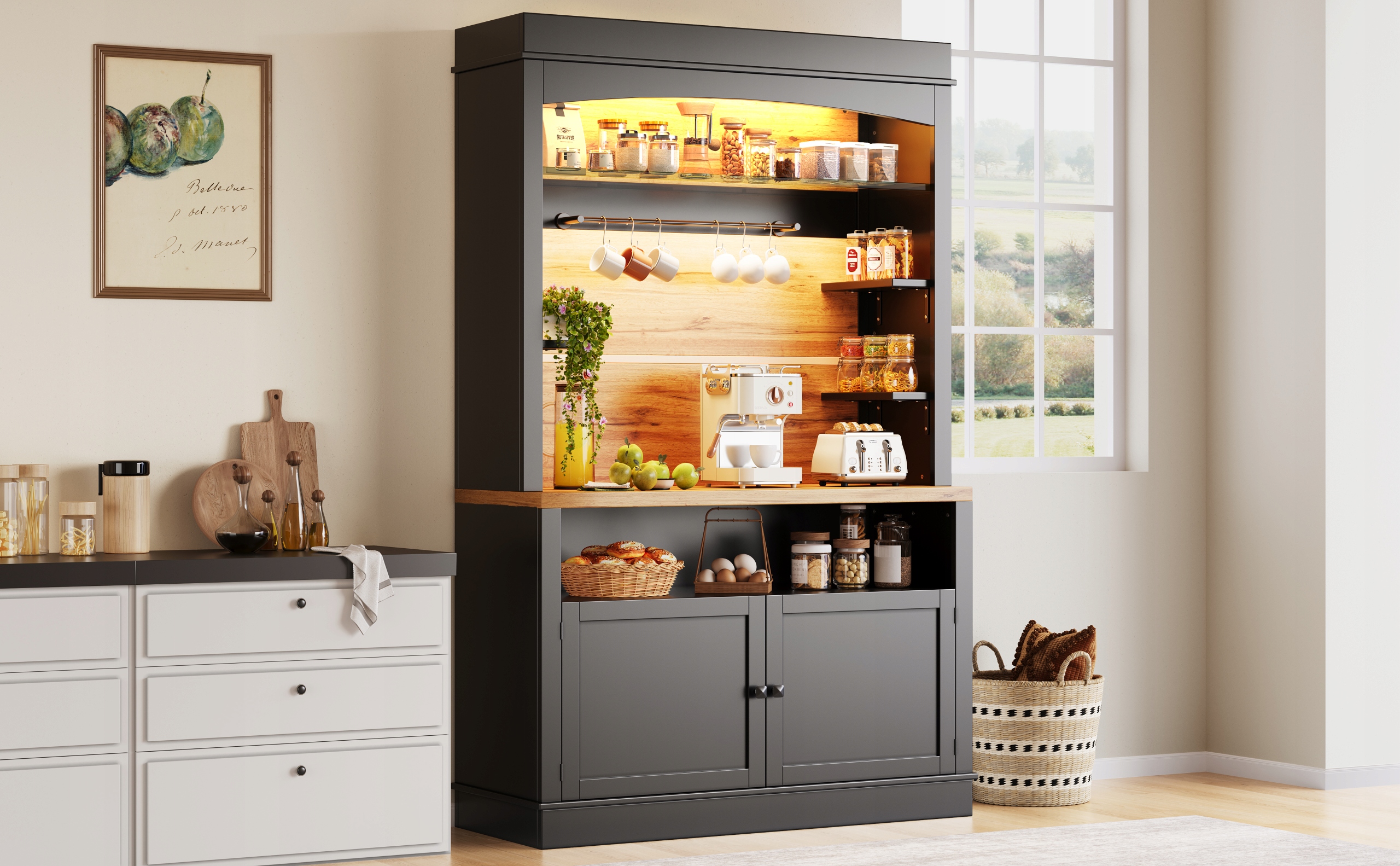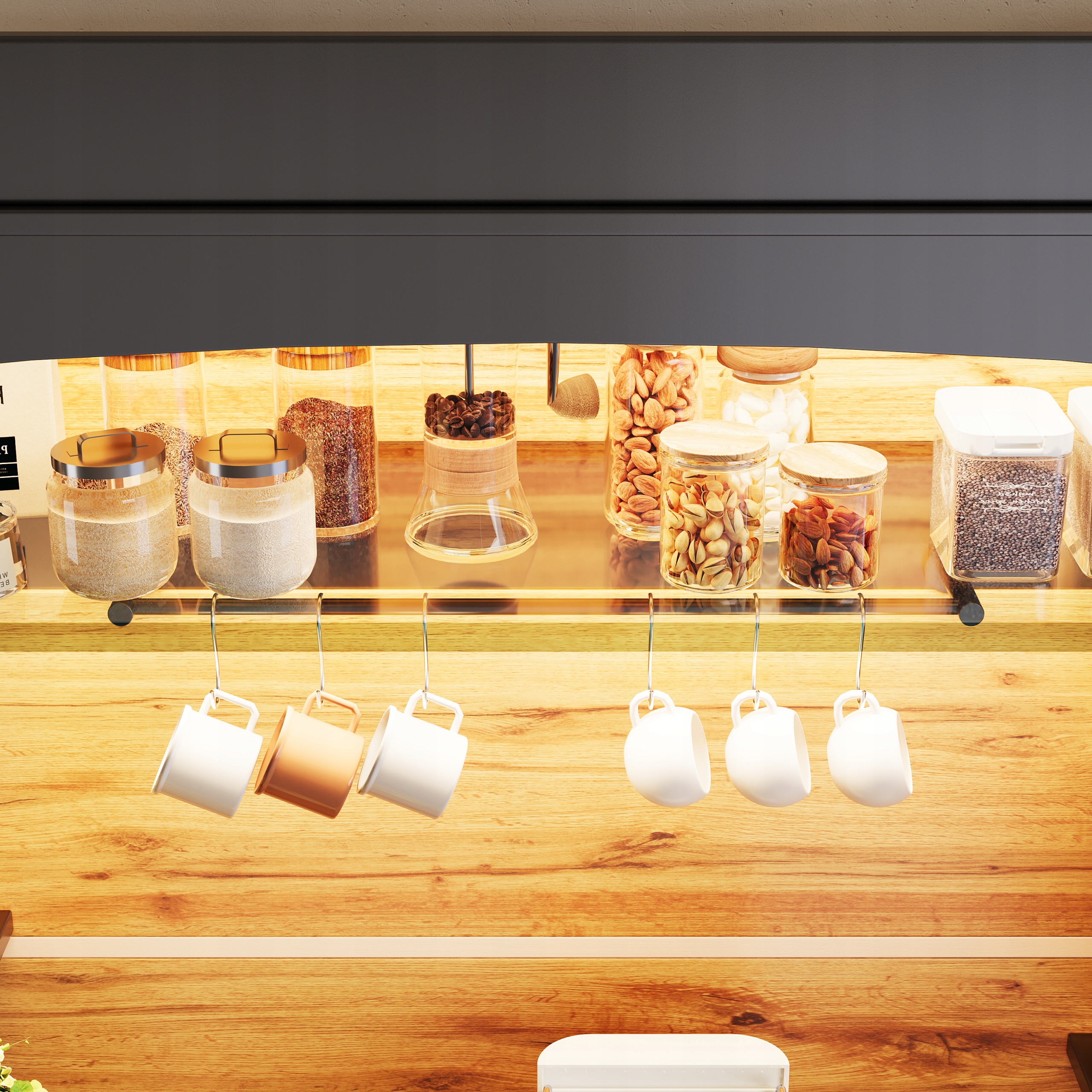 - Оснащено рейкою для вішалок і шістьма гачками для чашок із ручками, що економить місце на стільниці. Внизу розташована велика стільниця і дводверна шафа для зберігання кухонного приладдя, такого як фритюрниця, кавоварка і тостер. Відкрита центральна полиця з бічними відділеннями пропонує простір для різноманітних пляшок і банок, що відповідає всім вашим кухонним потребам.