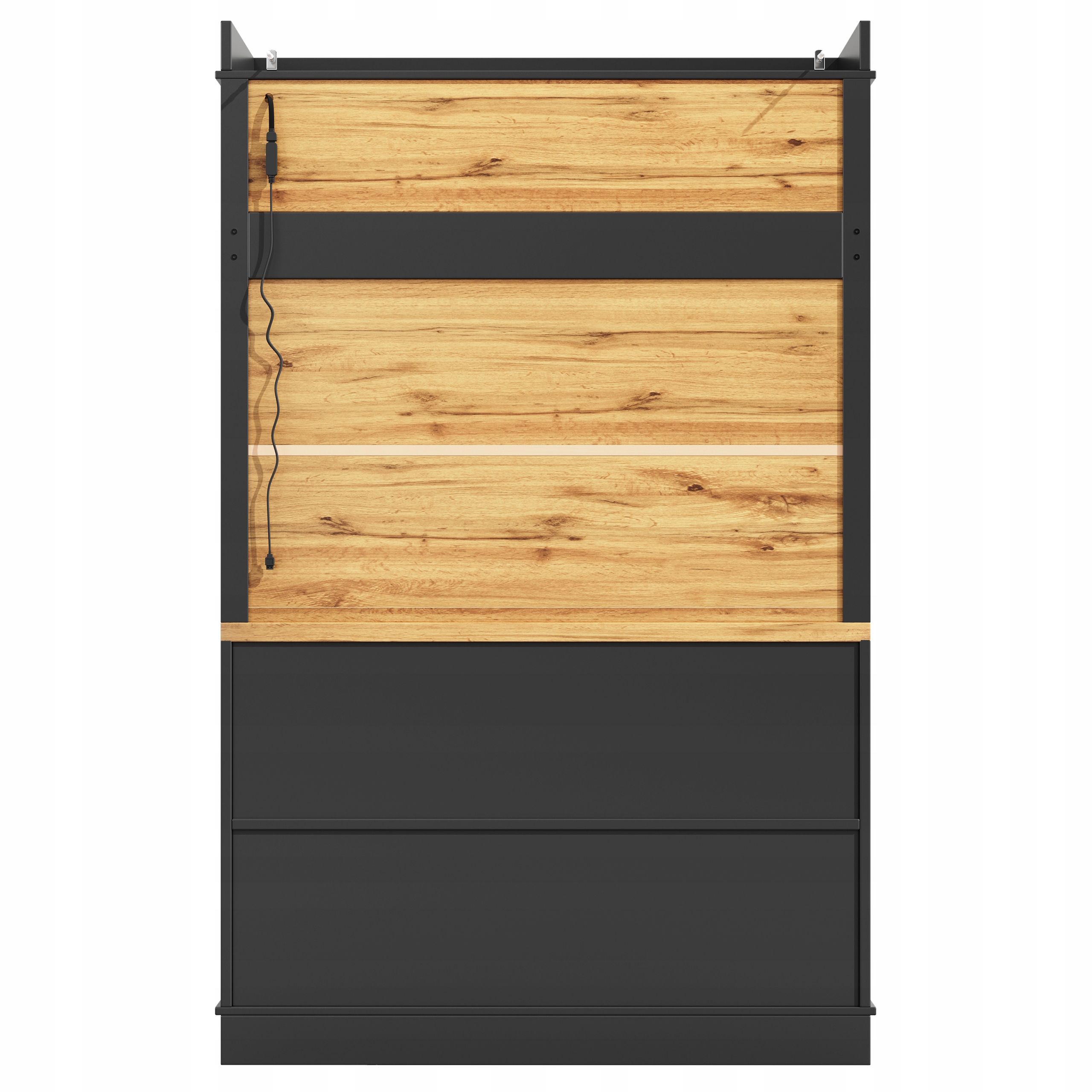 - Шафа оснащена елегантною світлодіодною системою освітлення, що живиться від USB. Додаток для смартфона дозволяє керувати кольором і яскравістю світла і навіть відтворювати музику - урізноманітнюючи повсякденне життя. Це універсальне освітлення дозволяє використовувати шафу не лише на кухні, але й як вітрину у вітальні.