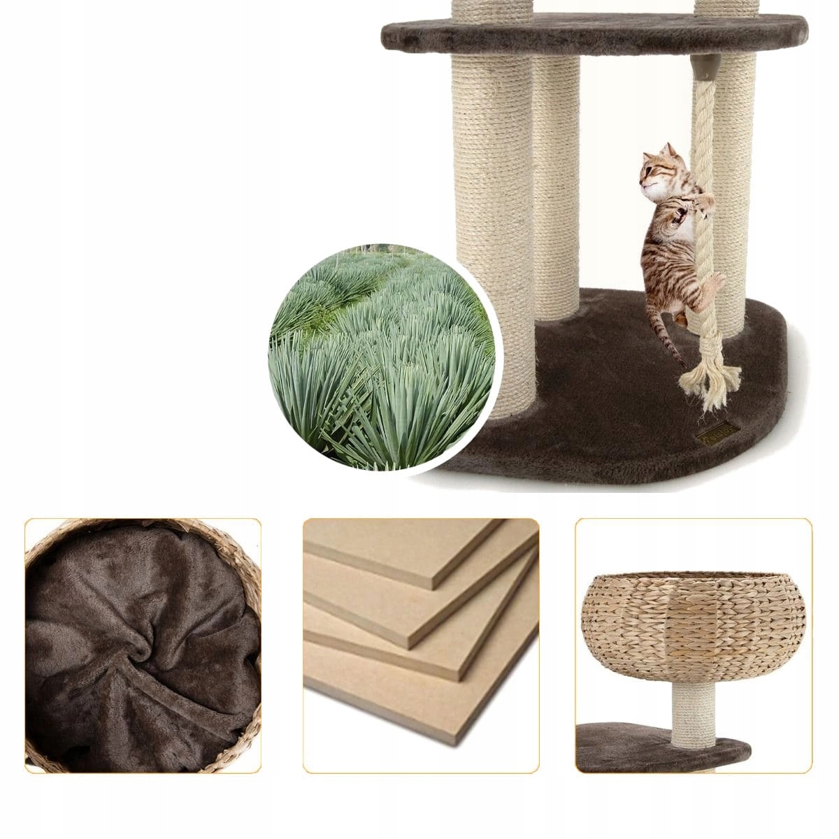 Задоволення потреб кота: високоякісні сизальні бруски заохочуватимуть кішку підніматися на висоті та заточення кігтів. Завдяки цьому, ваш четвертий друг зробить звичку використовувати подряпин, і вам не доведеться турбуватися про меблі. Кошик і лігво сплетені вручну з водного гіацинта - вибраного матеріалу з високою проникністю повітря.