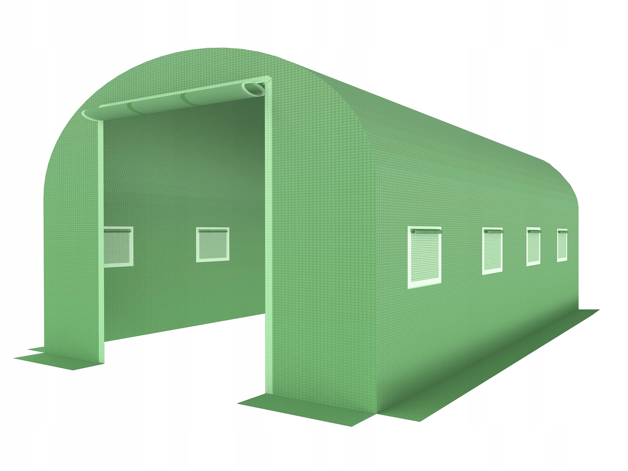 Тунельна кришка, виготовлена з PE фольги з uv = 4 функцією ізоляції фактора. У бічних стінах є вікна з сітками комарів , завдяки яким ви можете самостійно контролювати температуру та циркуляцію повітря , а також захищати від комах . Кожна з стін розширюється, щоб створити спеціальний фартух , який можна покрити піском, щоб уникнути повішення. Завдяки вбудованій сітці з ПП плівка стійка до пошкодження або сліз .
