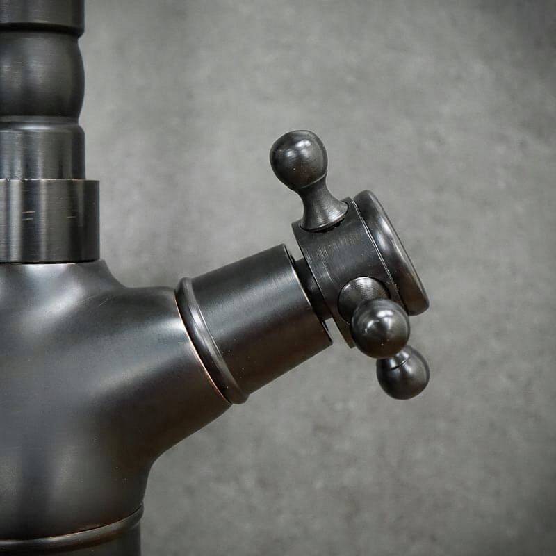 Змішувач для стільниці з латуні у вінтажному стилі — це високоякісне рішення, яке ідеально підійде для сучасних композицій. Він делікатно доповнить ретро-декор, а в сучасні та мансардні кімнати додасть трохи старомодності, порушивши монотонність. Додатковою візуальною перевагою є використання класичних кранів. Високий і довгий поворотний вилив надає пропонованій моделі універсальності - змішувач може стати змішувачем для кухонної раковини або настільного змішувача у ванній.