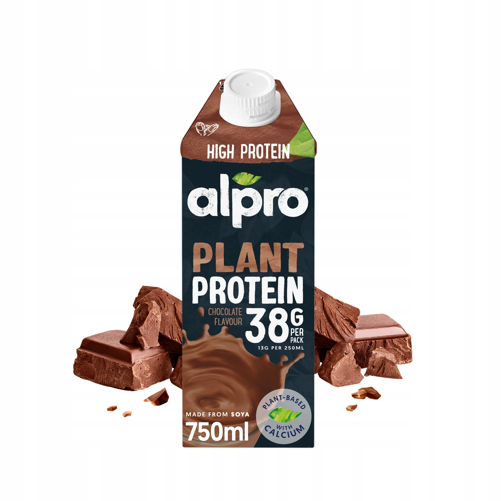 Alpro High Protein з шоколадом аромат виготовлений на 100% рослинній основі. Це джерело кальцію, білка і вітамінів B2 і D, яке природно не містить лактози і глютену. Alpro High Protein з високим вмістом білка виготовляється виключно з використанням сої без генетичних модифікацій і може бути цінним доповненням до щоденної їжі для кожного.