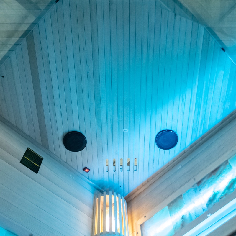 Дерев'яні сидіння, виготовлені з канадської ялиці, забезпечують максимальний комфорт і довговічність протягом багатьох років. Крім того, сауна оснащена сучасним світлодіодним освітленням з кольоротерапією, яке не тільки створює приємну атмосферу, але й сприяє релаксації та регенерації організму. У набір також входять такі аксесуари, як відро, черпак, термометр, пісочний годинник, модуль Bluetooth і динаміки, які дозволяють відтворювати улюблену музику і створювати ідеальну атмосферу. Надзвичайну атмосферу також створюють дві великі соляні лампи, які додають чарівності та підтримують здоров’я дихальних шляхів і стан шкіри.