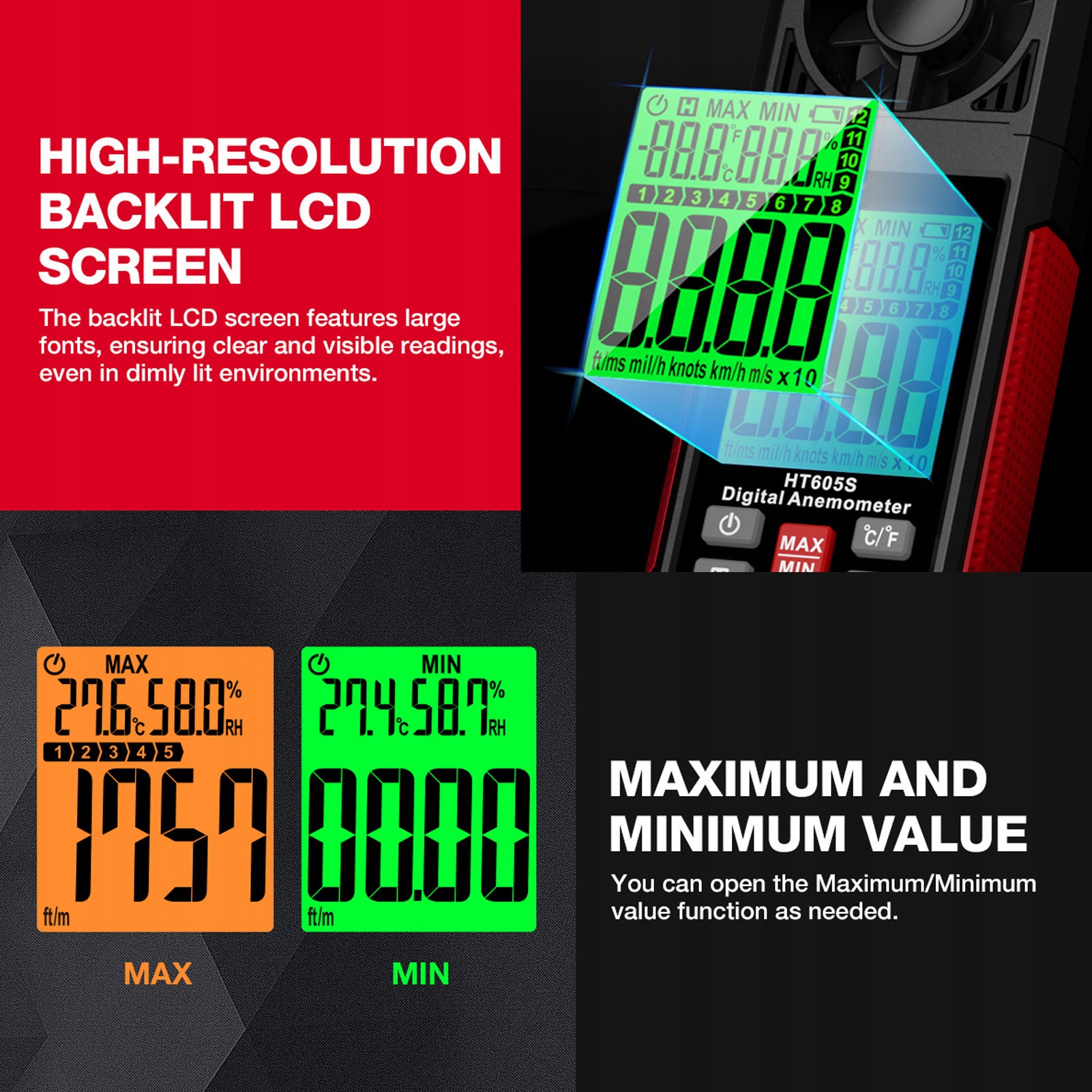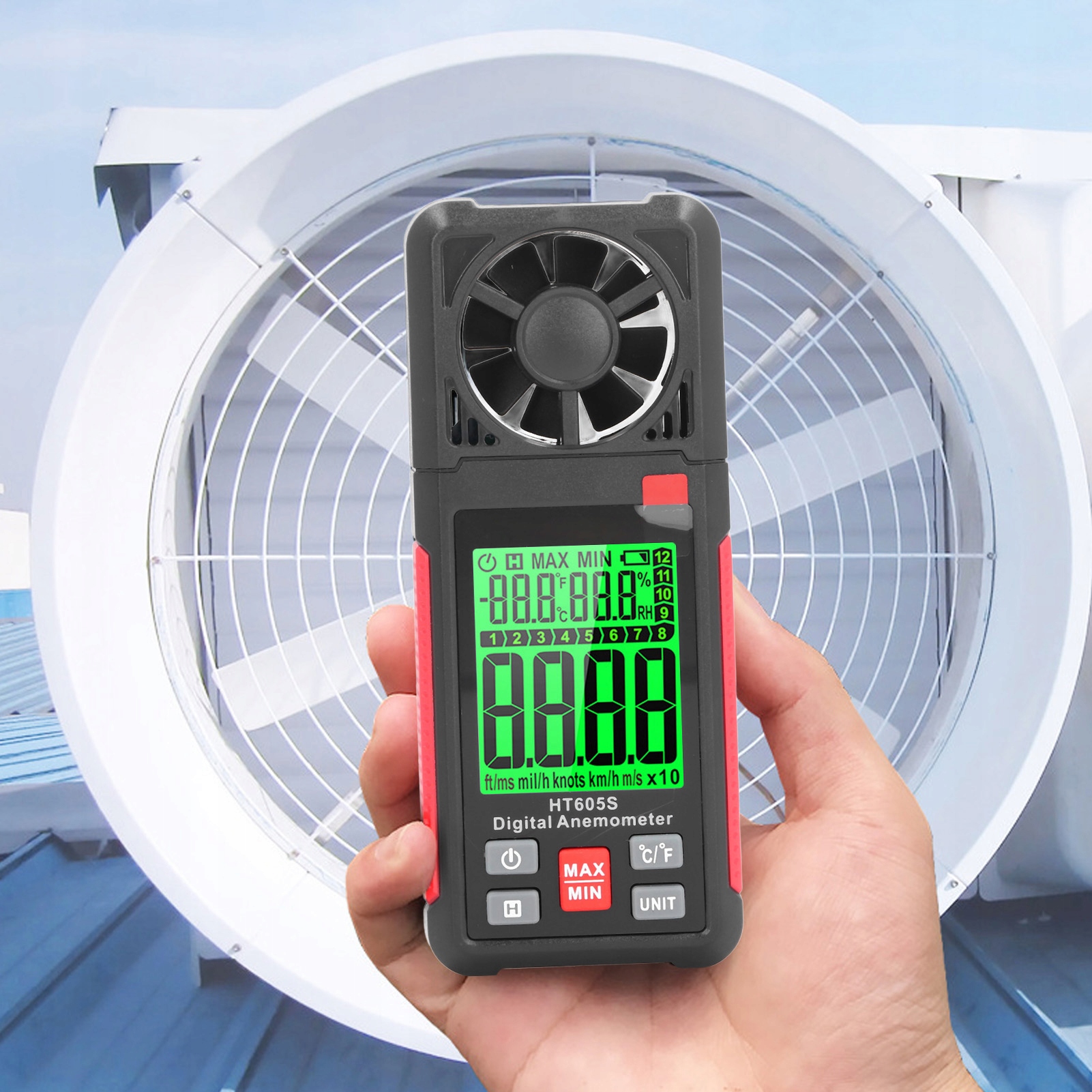 2. 6 одиниць вимірювання: цей вимірювач швидкості вітру оснащено лопатями вентилятора, які легко обертаються, і вимірює швидкість вітру в 6 одиницях, таких як фути/м, фути/с, милі/год, вузли, км/год, м/с, значення швидкості вітру x10.