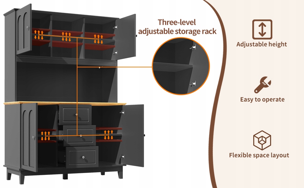 - Інноваційна 3-рівнева система полиць із відділеннями, що регулюються по висоті. Збільшує використання простору для зберігання на 40% і адаптується до різних потреб.