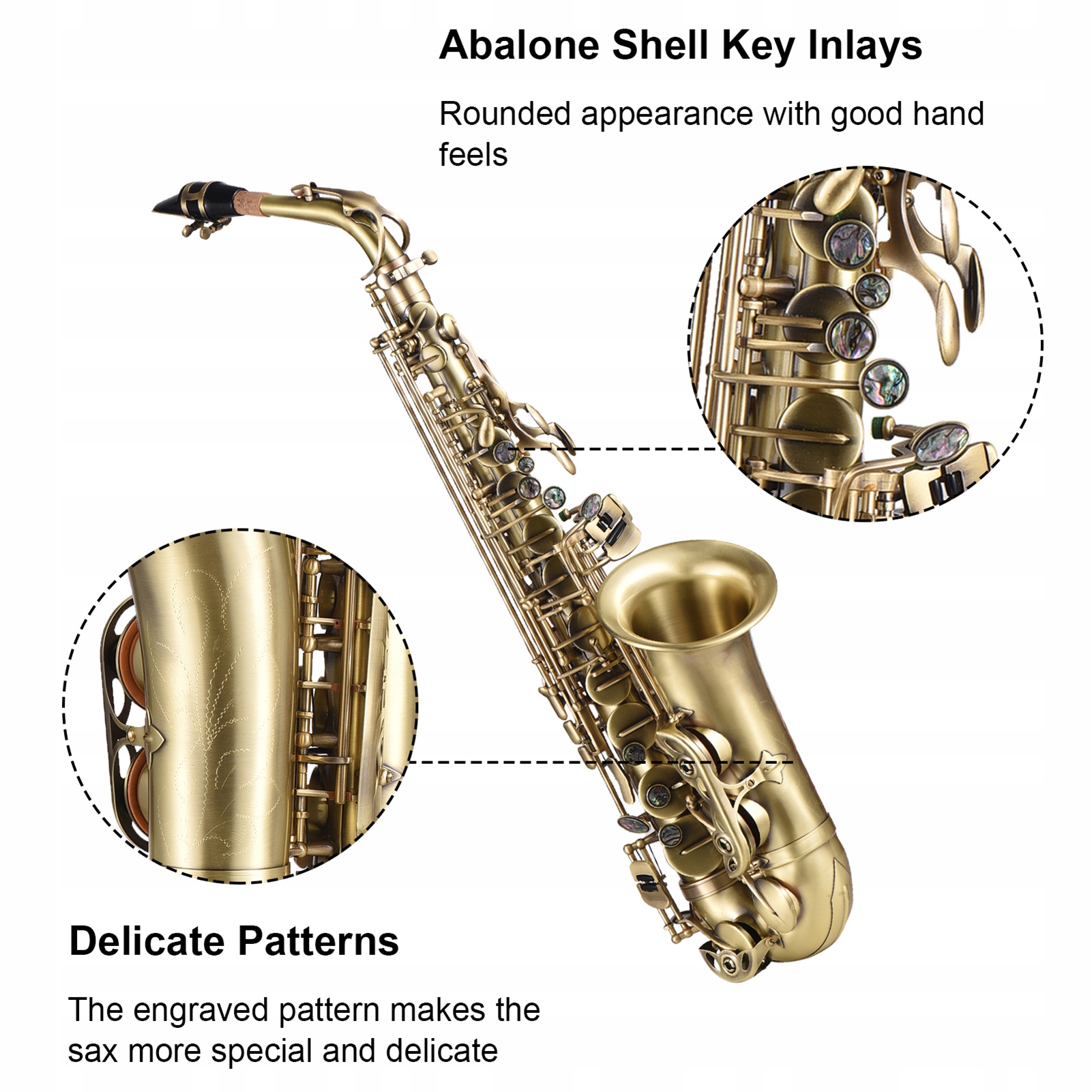 - Цей альт-саксофон E-Flat Bend підходить для професійних саксофоністів. Виготовлений із високоякісної латуні з поверхнею під старовинний візерунок і кнопками на черепашці тощо.