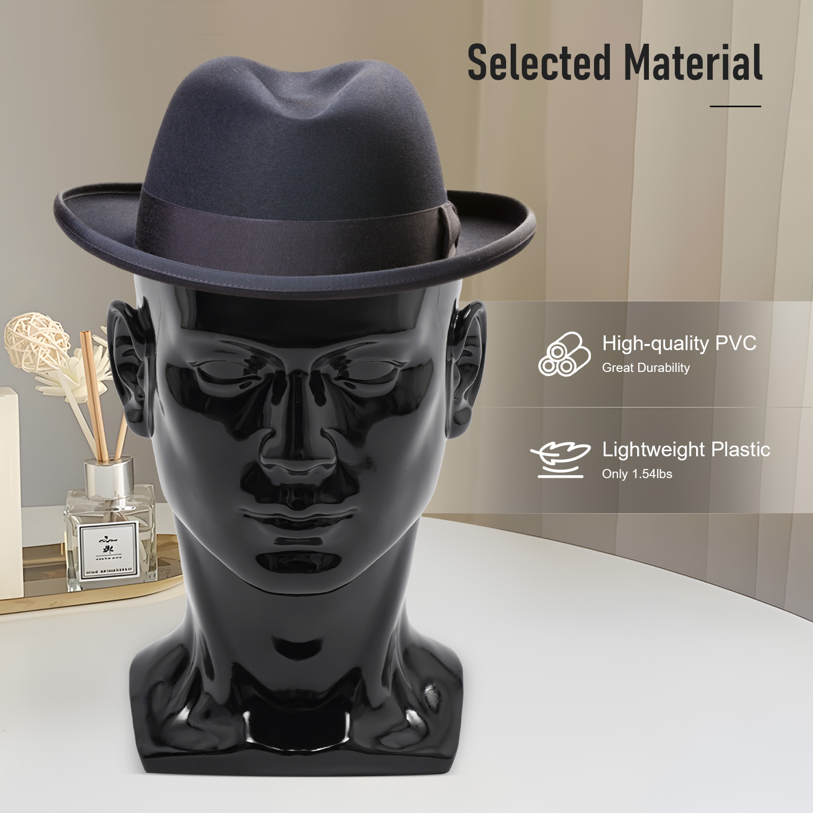 ◾ Вам потрібна така манекенська голова для експозиції вікон. Він виготовлений з високоякісного ПВХ -пластику і є високостійким до вандалізму. Стійка основа та кріплення отворів дозволяють розміщувати її у вікно, не боячись, що вона легко ковзає. Його яскравий чорний колір забезпечує чудовий контраст і кращий контекст для ваших перуок, шапки, окулярів тощо