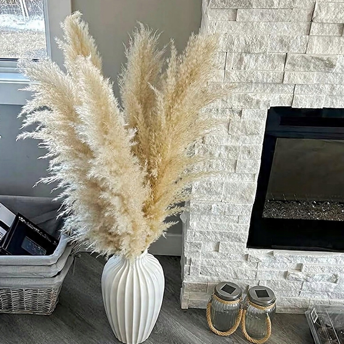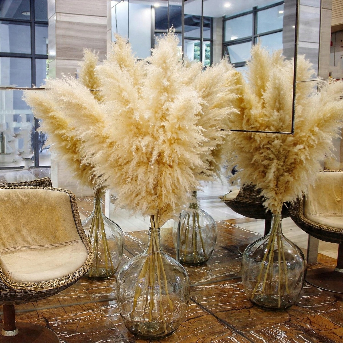 Ви можете використовувати невеликі шматочки сушеної трави Pampas і висушити їх на сонці, поки вони не стануть більш інтенсивним виглядом. Прикраси сушених квітів матимуть яскравий вигляд, не впливаючи на остаточний вигляд. Ви також можете використовувати лак для волосся для виправлення квітів з травами. Висушені квіти з трави Pampas можуть зайняти тривалий час, ви можете заощадити час, не потребують поливу, набір ваз із травою Pampas (не входить) дуже красивий.