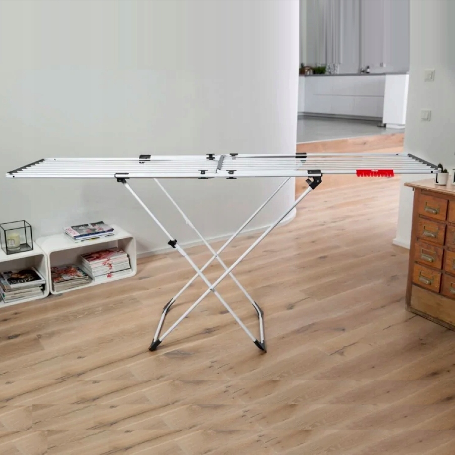 Висувна сушильна машина Doble із ручками, що перекриваються, ідеально підходить для сушіння як маленької, так і великої білизни. Дві незалежні рами, що перекриваються, забезпечують універсальність і можливість регулювання довжини від 105 см до 209 см. Завдяки товстому дроту він запобігає утворенню складок на одязі, водночас скорочуючи процес прасування.