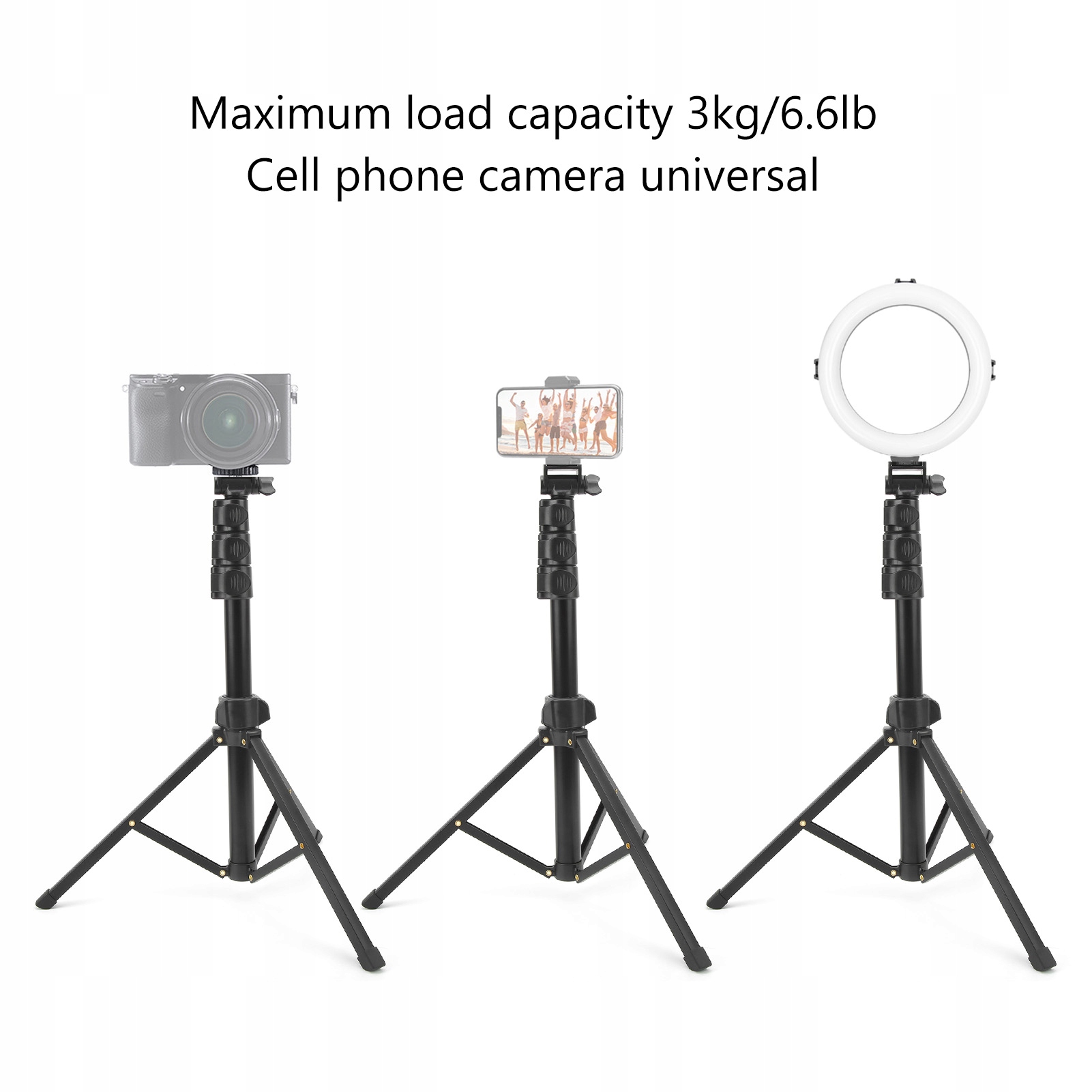 5. 1/4 дюйм гвинтового інтерфейсу: телефонний штатив з максимальною ємністю завантаження 3 кг, універсальної камери на мобільному телефоні. Верхній гвинтовий інтерфейс 1/4, універсальна конструкція, що забезпечує більшу сумісність.