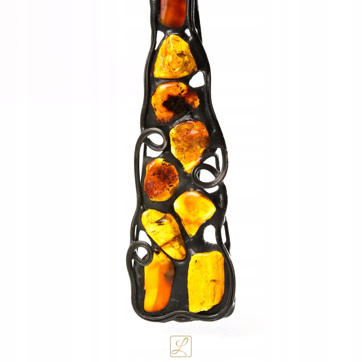 Хрест виготовлений методом художньої рукоділля. Використані шматочки балтійського бурштину прояснені тиском і поліровані, підібрані за формою та кольором. Контур хреста створений шляхом згинання подвійного латунного дроту, з привабливими петлями, які дуже нагадують техніку золотарства під назвою філігрань. Утворений простір заповнюють бурштином, потім все покривають чорною патинованою жерстю. Польський продукт - ми підтримуємо польські ремесла.