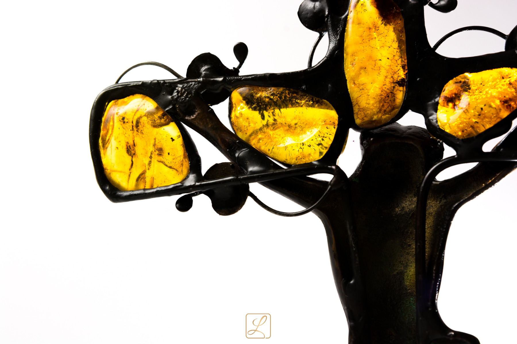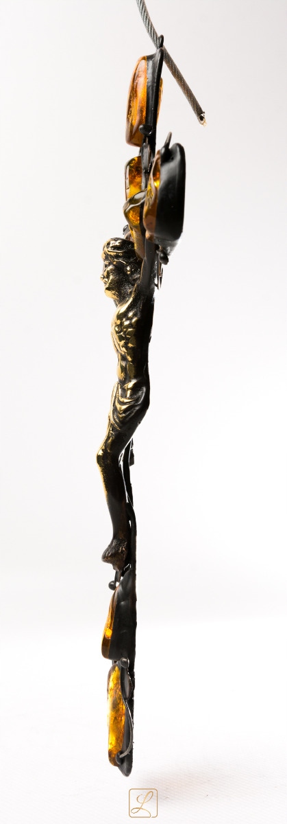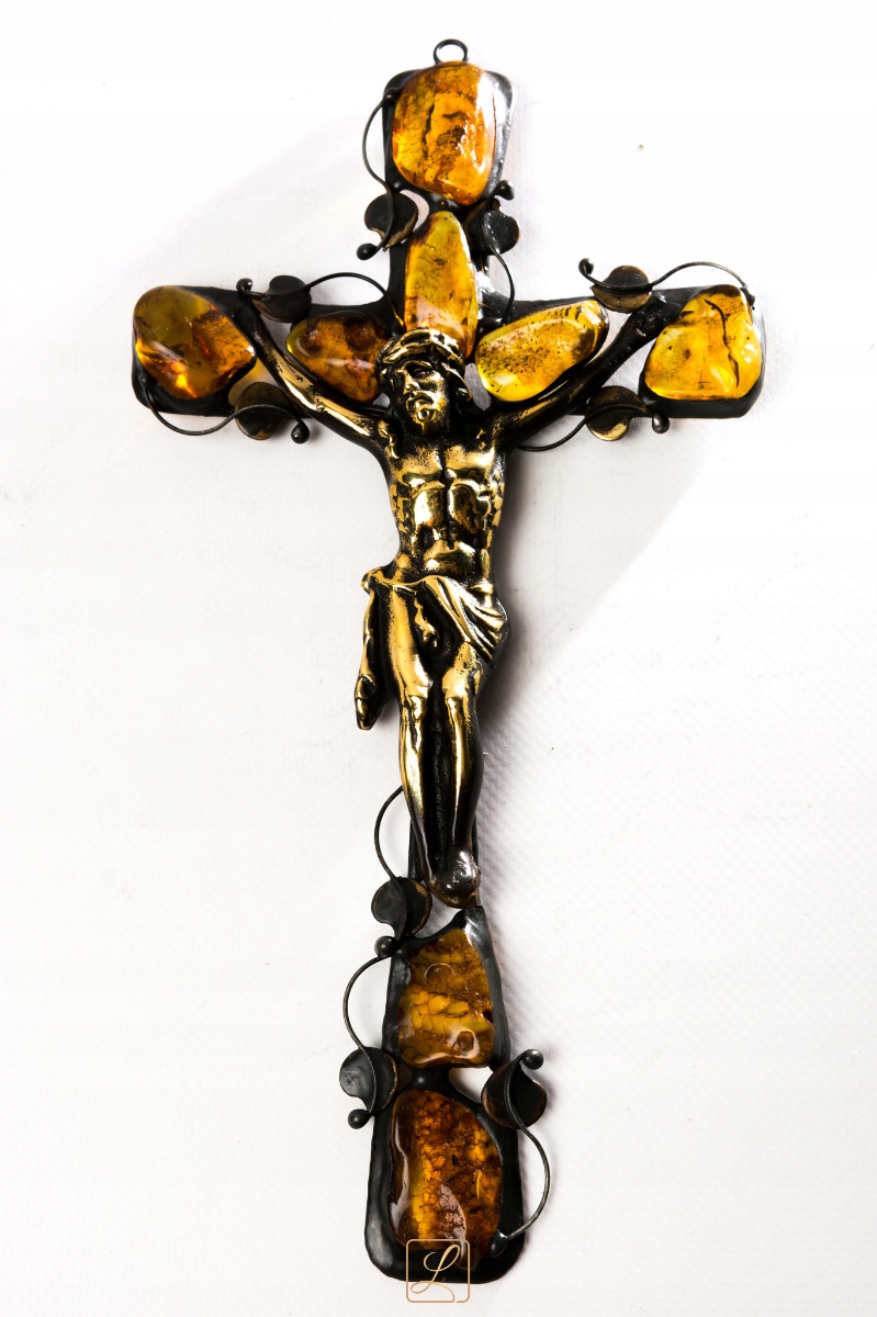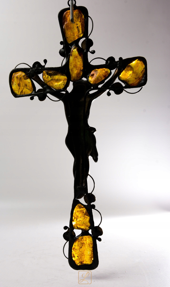 Хрест виготовлений методом художньої рукоділля. Використані шматочки балтійського бурштину прояснені тиском і відполіровані. Камені використовуються дійсно великі, що вирішальним чином впливає на ціну виробу. Чим більше штук, тим вища ціна. Контур хреста створюється шляхом згинання латунного дроту, який потім заливається бурштином. Пристрасть з латуні. Польський продукт.