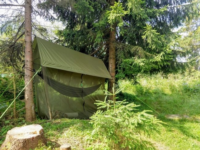 Ширина TARPA/Płachy Górna не така велика, як стандартні шини, а в поєднанні з відповідним матеріалом сітка комара забезпечує захист навіть від того, щоб тримати дощ. У виняткових ситуаціях цей намет може бути притулком для двох - однією людиною в гамаку, інша, що спить під ним, на підлозі.