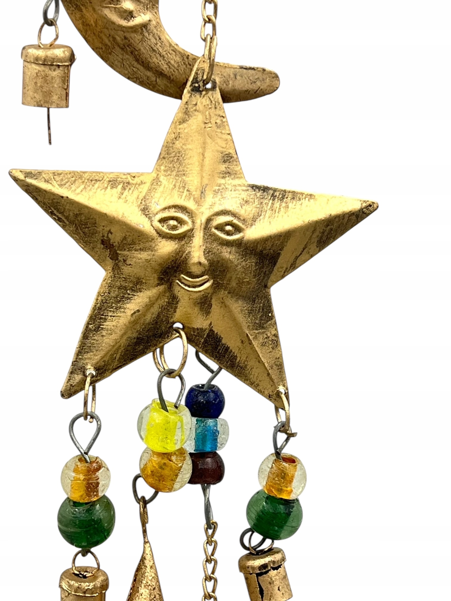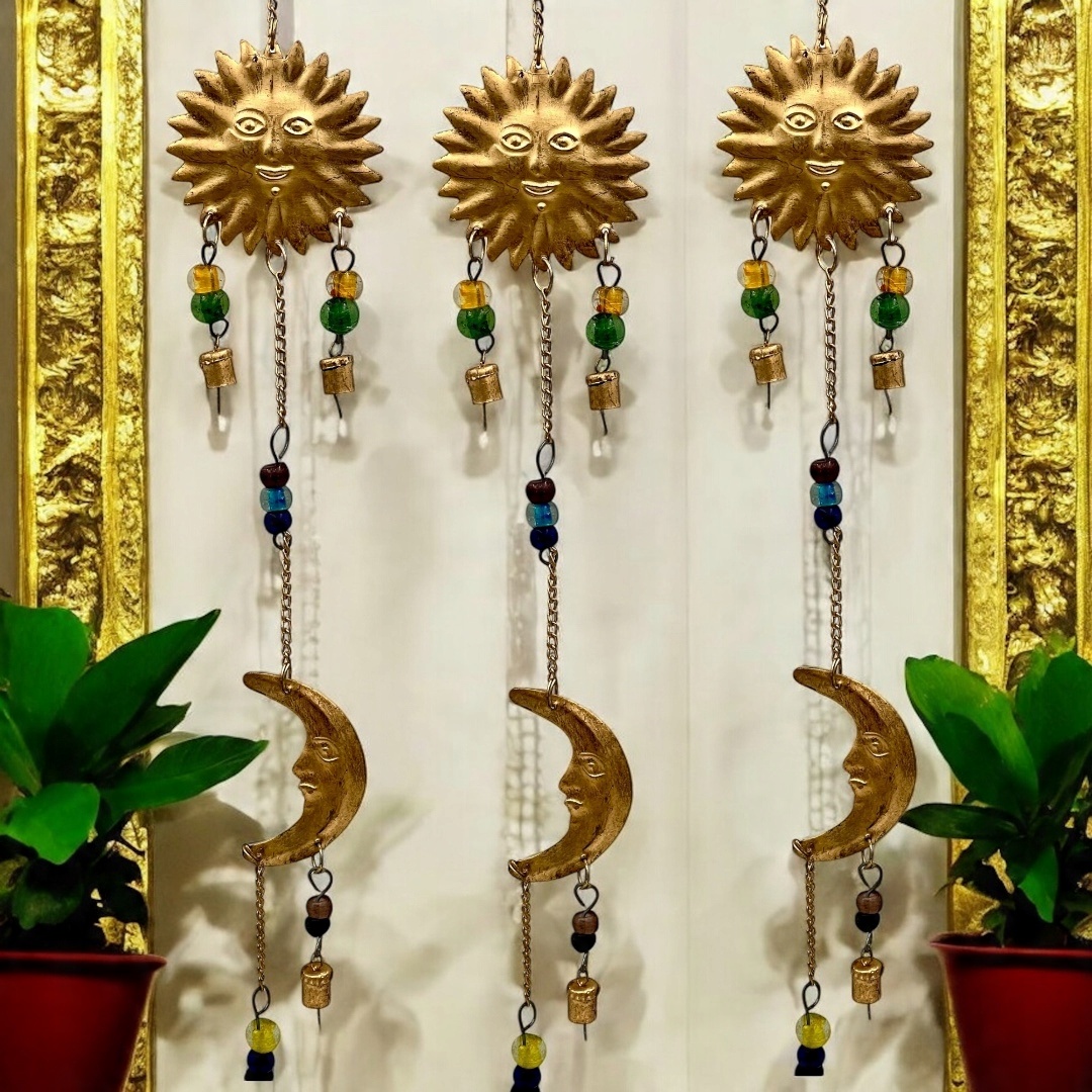 Унікальний металевий кулон із зображенням символічного тріо: сонце, місяць і зірка. Виготовлений у золотому відтінку, прикрашеному барвистими намистинами та декоративними дзвіночками, він ідеально відповідає інтер’єру в бохо, східному та етнічному стилі. Він походить з Індії, де ремесла мають давню традицію.