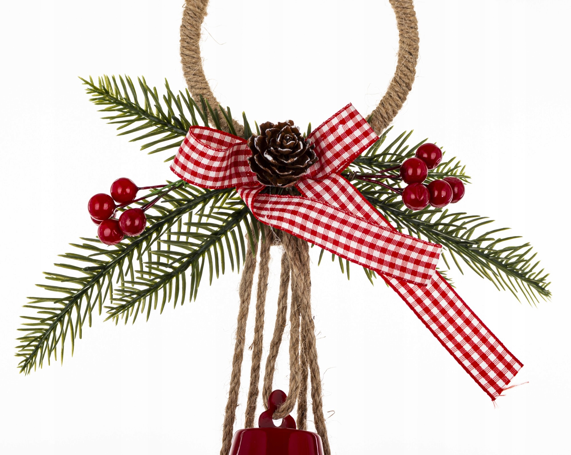 Створіть унікальну атмосферу Різдва з порогу! Прикраса з металевими дзвіночками, конусом, зеленими гілками та картаним луком - це класична різдвяна прикраса, яка підкреслить шарм вашого інтер'єру чи вхідних дверей.