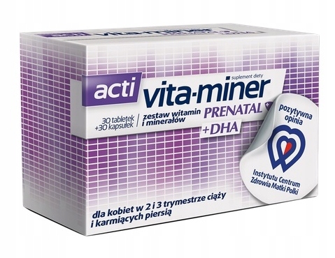 Дієтична добавка Acti Vita-miner Prenatal +DHA – це препарат, що доповнює раціон вагітних і годуючих жінок. вітаміни та мінерали та поліненасичені омега-3 жирні кислоти. Продукт розроблений для жінок у 2-му та 3-му триместрах вагітності.