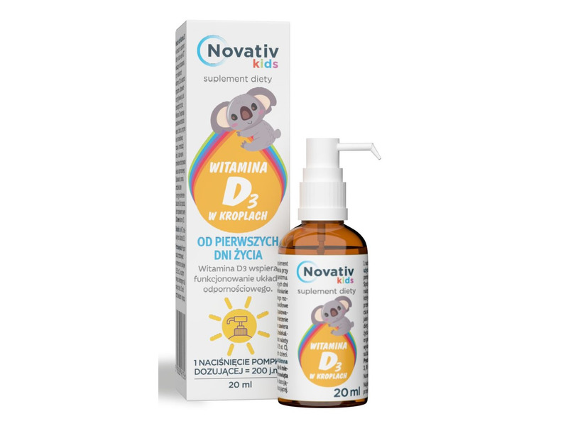 Novativ Kids Vitamin D3 у краплях - це дієтична добавка для використання у віці 1 місяця. Вітамін D3 підтримує належне поглинання кальцію та фосфору та сприяє належному розвитку та мінералізації кістки. Вітамін D3 також підтримує належне функціонування імунної системи. Упаковка з насосом дозволяє легко та точно вимірювати рекомендовану кількість підготовки.
