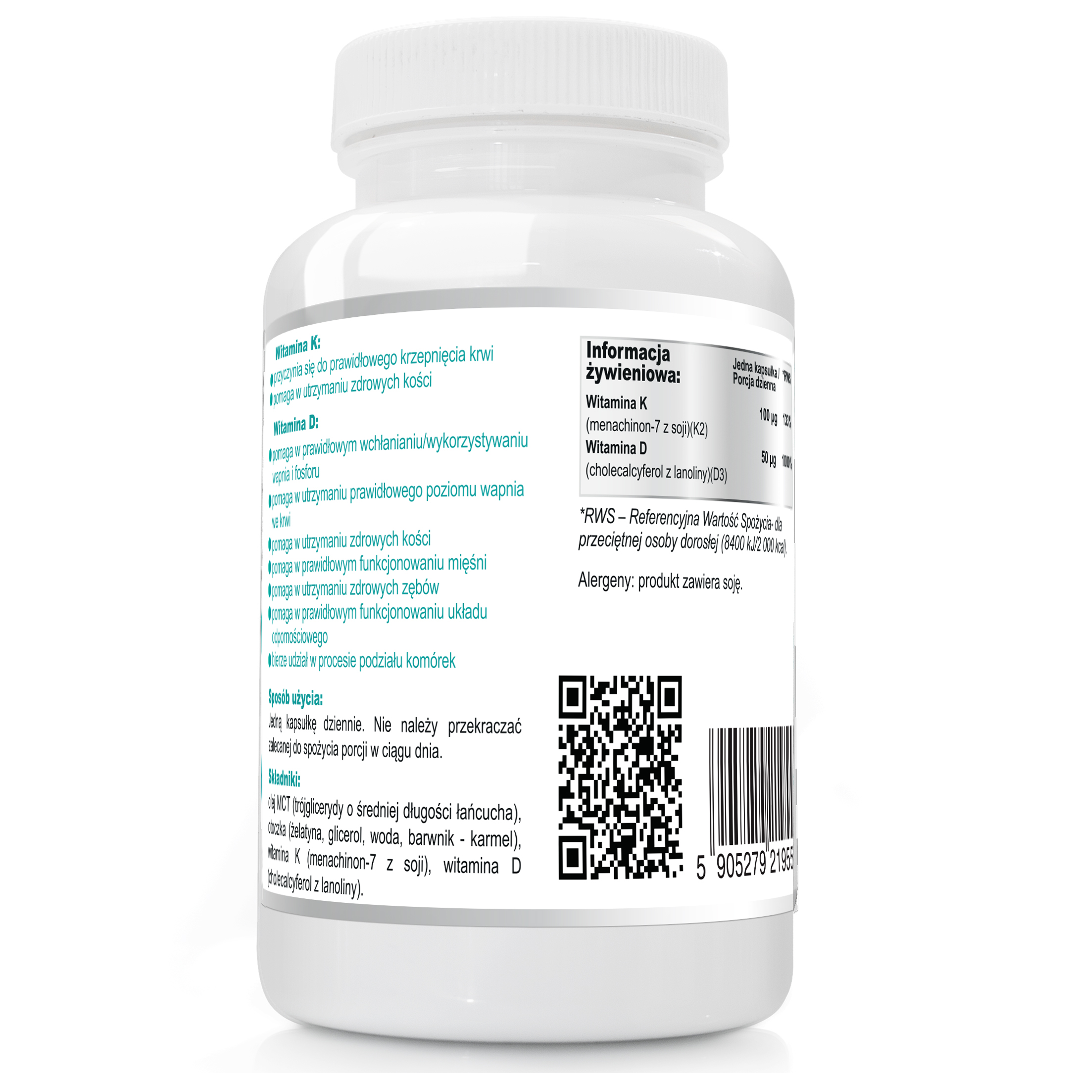 - одна капсула забезпечує 2000 МО вітаміну D3 і 100 мкг вітаміну K2 mk-7, який є найбільш біологічно активною формою вітаміну K, отриманого з натто - ферментованої сої.