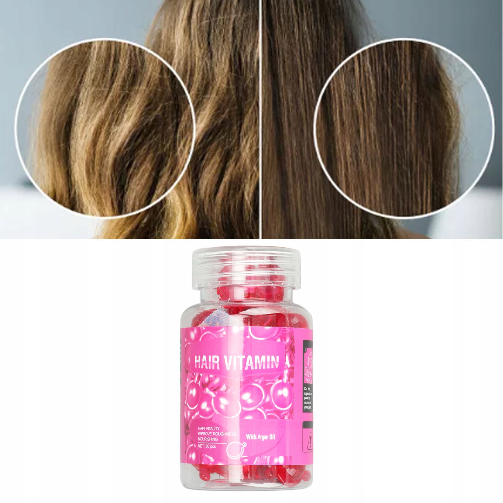 Особливість: 1. Підтримує блиск волосся: Капсули для догляду за волоссям були спеціально розроблені, щоб надати волоссям здорового блиску, захистити їх від пошкодження сонця та зберегти здоровий та живильний вигляд.