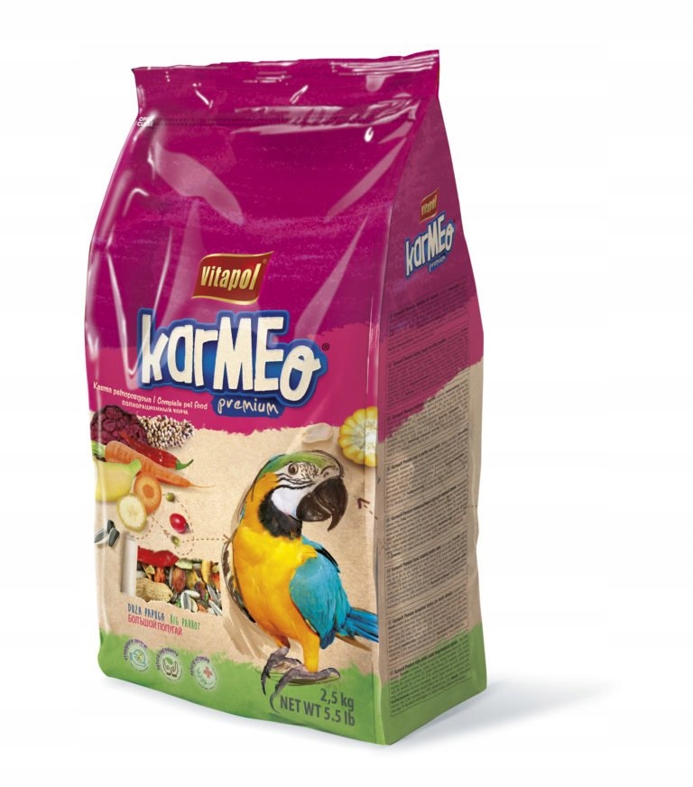 Karmeo — нова, вдосконалена рецептура базової лінійки продуктів харчування Vitapol. Корм був збагачений екструдованими інгредієнтами на основі фруктів і люцерни, багатих поживними речовинами і пігментами. Щоб підтримувати птицю в кращій формі, кількість високожирних інгредієнтів значно зменшено. Додавання подрібнених раковин устриць (природне джерело кальцію) забезпечить правильну структуру пір'я, кісток і кігтів. Вміст деяких сумішей листя евкаліпта має антибактеріальні, протигрибкові та противірусні властивості.