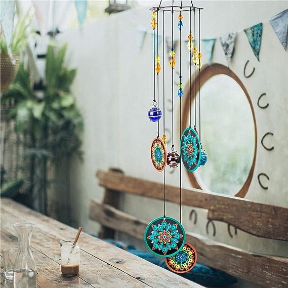 - Гарний малюнок мандали, розписаний вручну, і кришталеві намистини для чакри прикрашали вітер дзвінок, наповнений позитивною енергією та створюючи природні та заспокійливі мелодії, коли листовий метал стукає разом на вітрі.