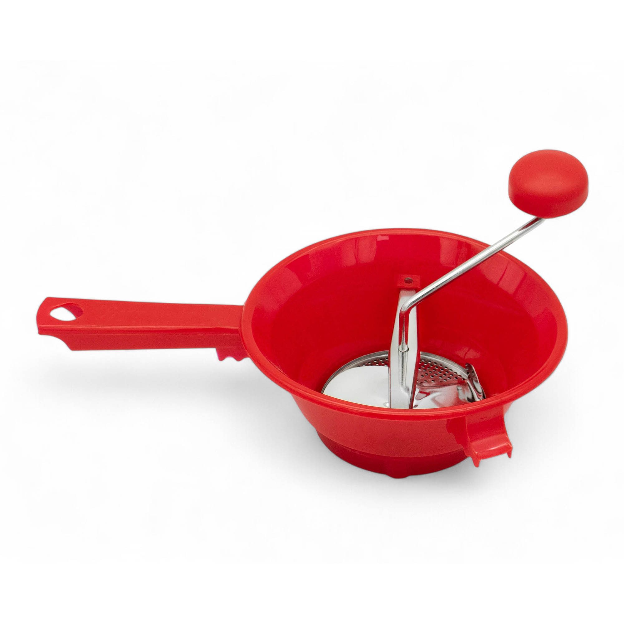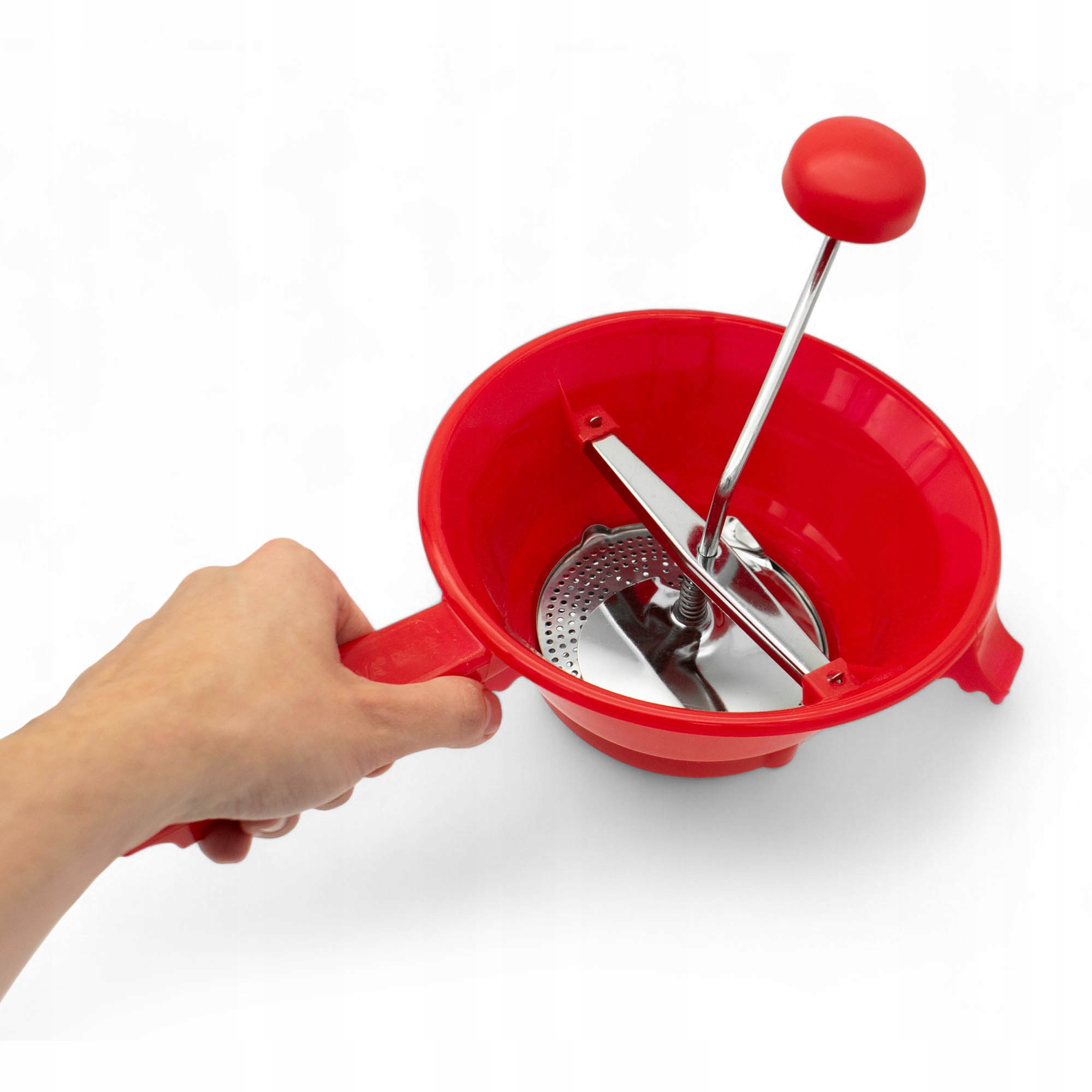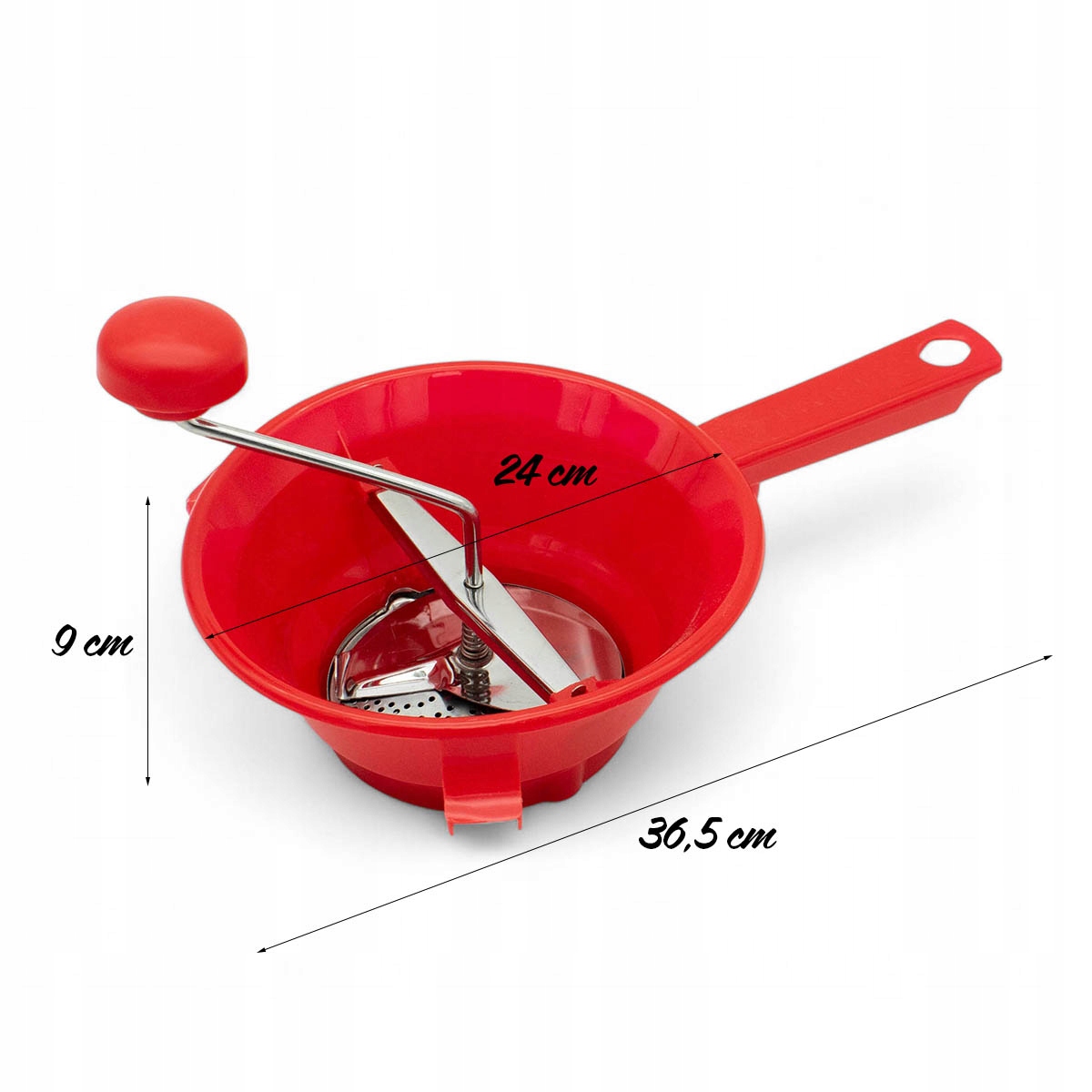 овочеві та фруктові пробудження виготовлені з високоякісної пластику. Ситечко і лезо виготовлені з нержавіючої сталі. Він має два змінних штамів з різним діаметром стібків. Продукт у 100% сейф , призначений для контакту з їжею. Матеріал виготовлення впливає на його легкість, завдяки якому використання пюре легко та зручно . Ручка з отвором для підвіски, ймовірно, знаходиться в руці, вона зручна. Легко в чистоті - знімні елементи.