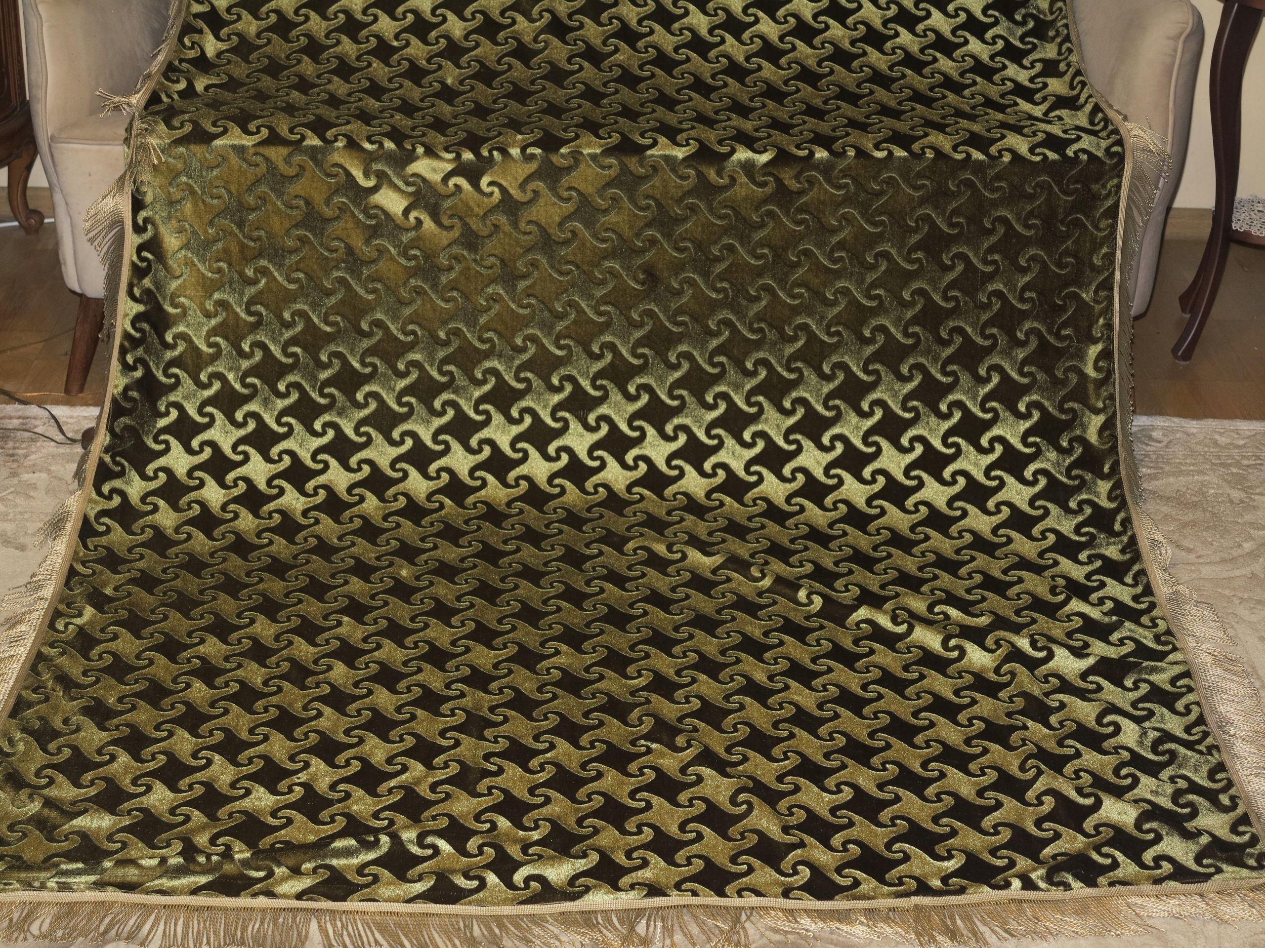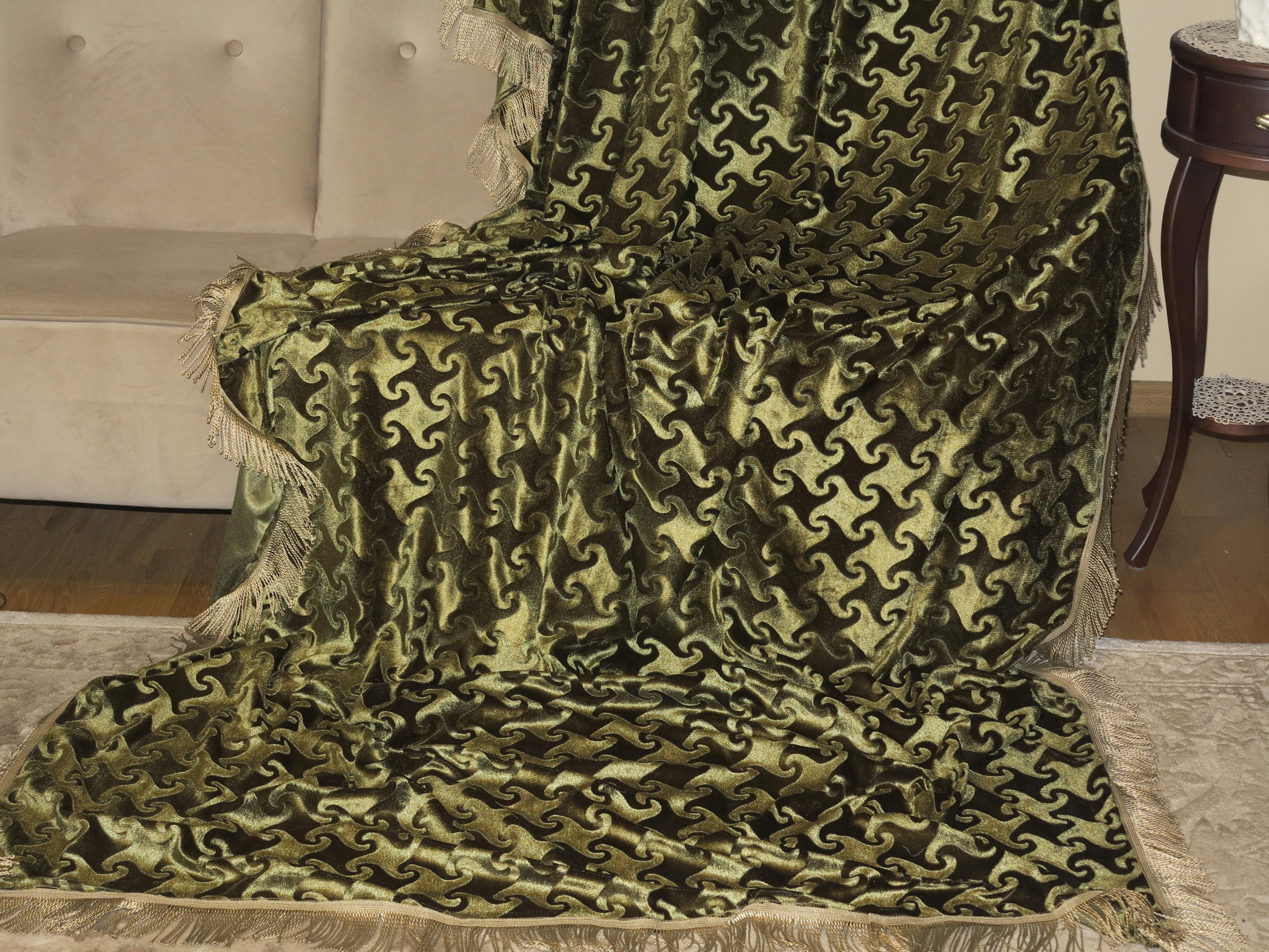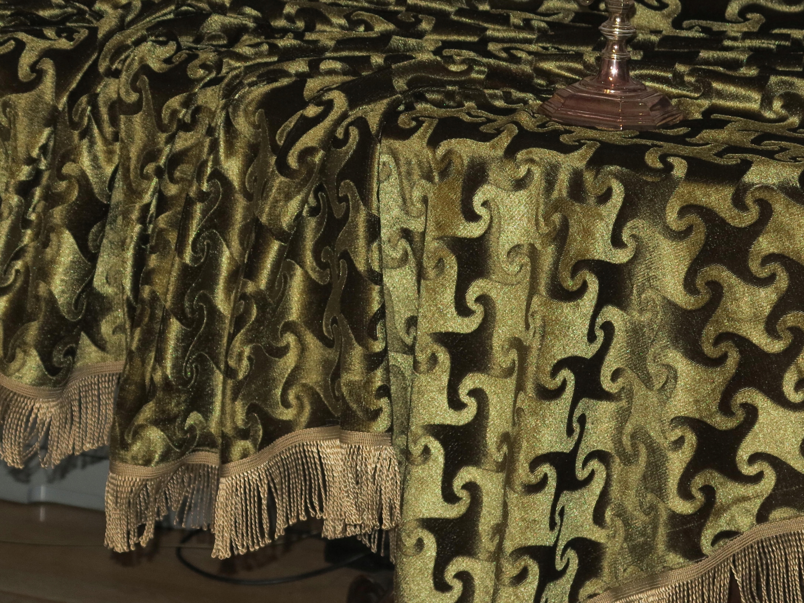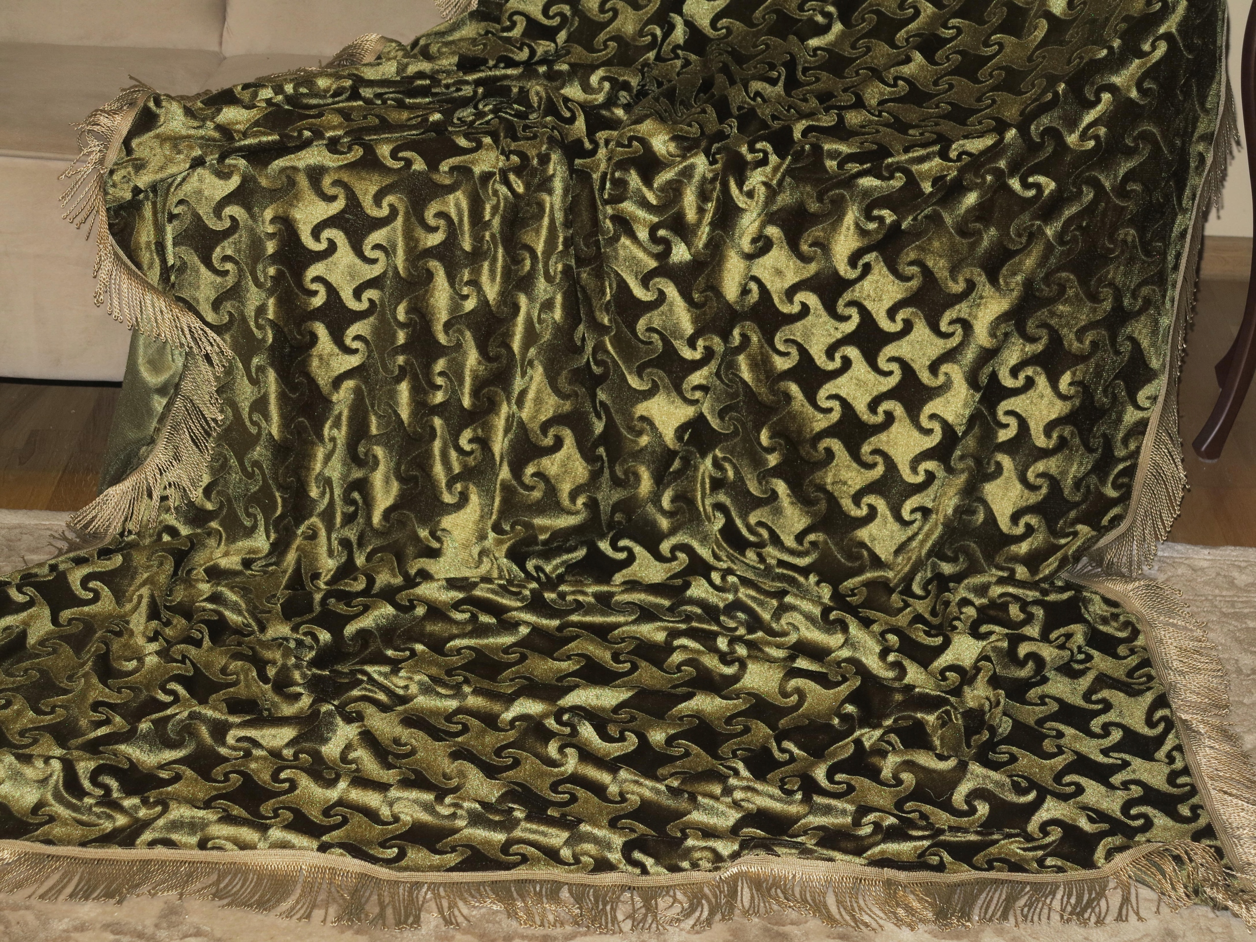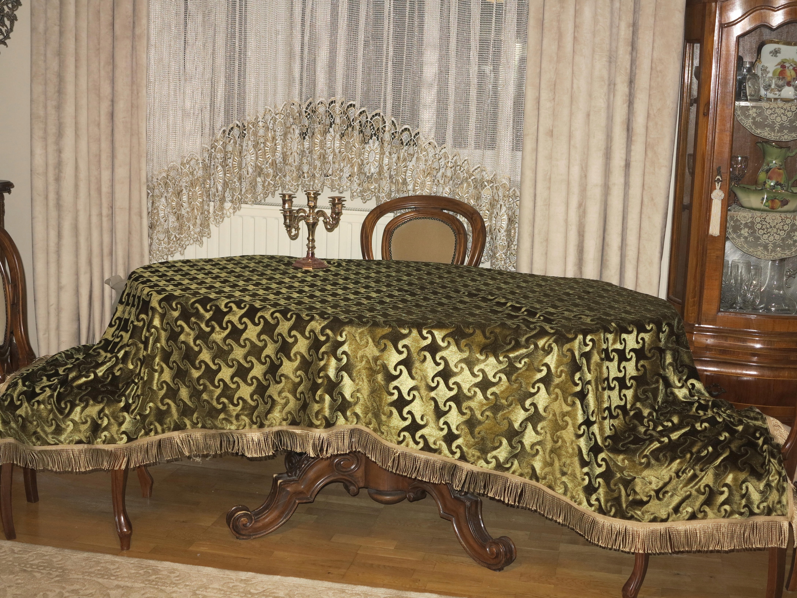витончена величезна скатертина, виготовлена з м'ясистого оксамитового оксамиту, із забитим візерунком, у стильному арт -модерні зелених. Столова скатертина, прикрашена золотими бахроми.