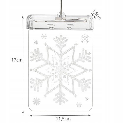- СПЕЦИФІКАЦІЯ - світлий колір: теплий білий; візерунок на вітражі: сніжинка; кількість світильників в світлодіодній стрічці: 6; живлення батарейки: 3 x AAA (не входять в комплект) розміри: 17 x 11,5 x 1,5 см; довжина кабелю: 19 см; розмір упаковки: 18 х 12,5 х 4,5 см; вага: 108 г; вага в упаковці: 121 г.