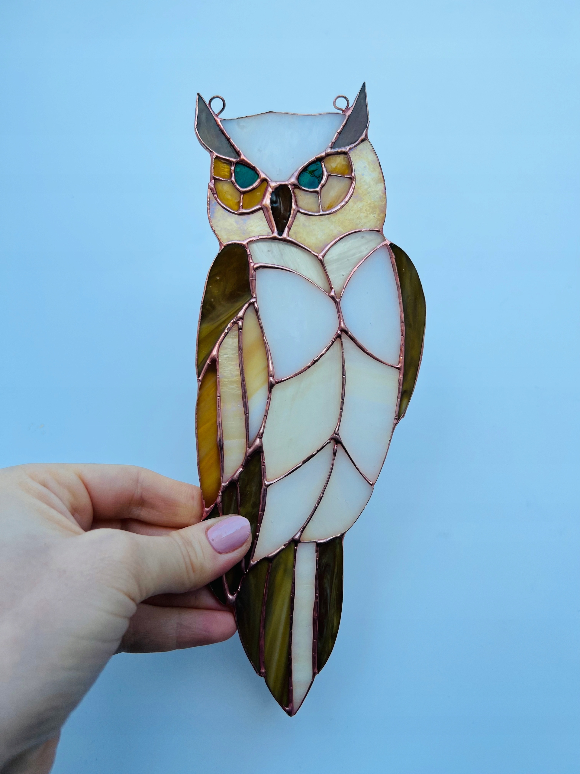 Ця вітражна сова, виготовлена з високою точністю та увагою до деталей, стане ідеальним подарунком для любителів сов і прикрас ручної роботи. Ця прикраса стане чудовим подарунком для любителів сов і для всіх, хто цінує красу прикрас ручної роботи.