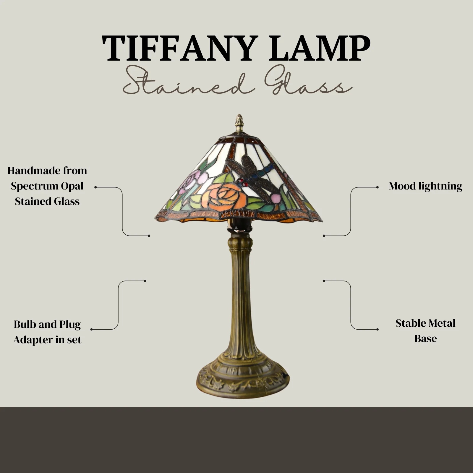 Красива настільна лампа в стилі Тіффані з абажуром із зображенням бабки на лузі. Унікальний великий світильник з вітражним абажуром і металевою основою. Виготовлений з ексклюзивних матеріалів - скла і перламутру, дуже акуратно, з увагою до найдрібніших деталей. Вся конструкція виконана з металу. У комплект входить енергозберігаюча лампочка класу АА++.