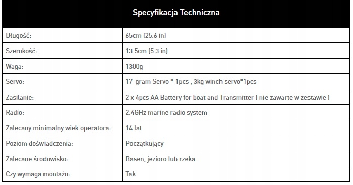 Вітрильник у версії ARTR, в набір входить модель, сервоприводи, передавач і приймач, потрібно купити 4 батарейки АА для живлення човна. , і 4 батарейки типу АА для живлення передавача.