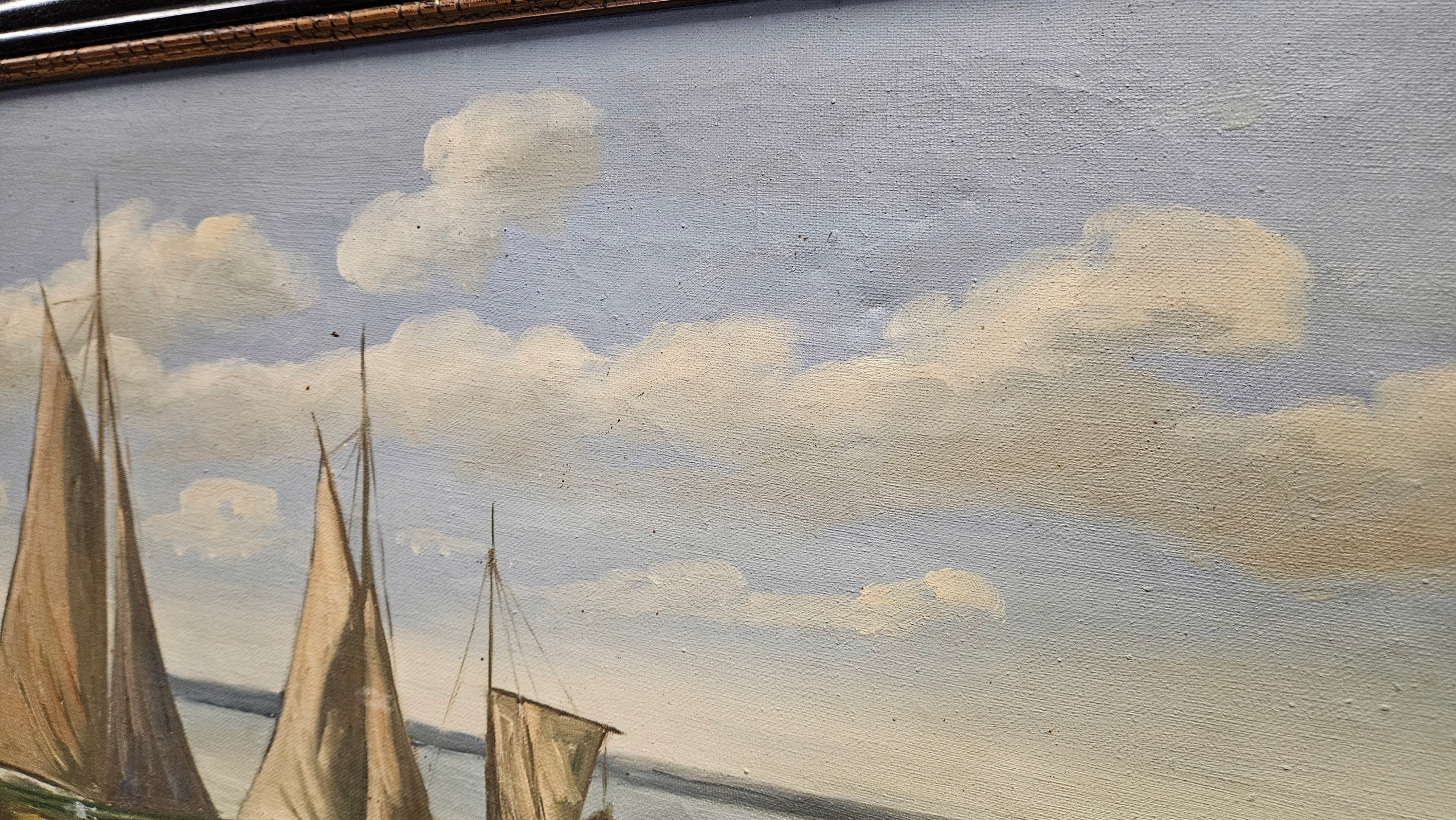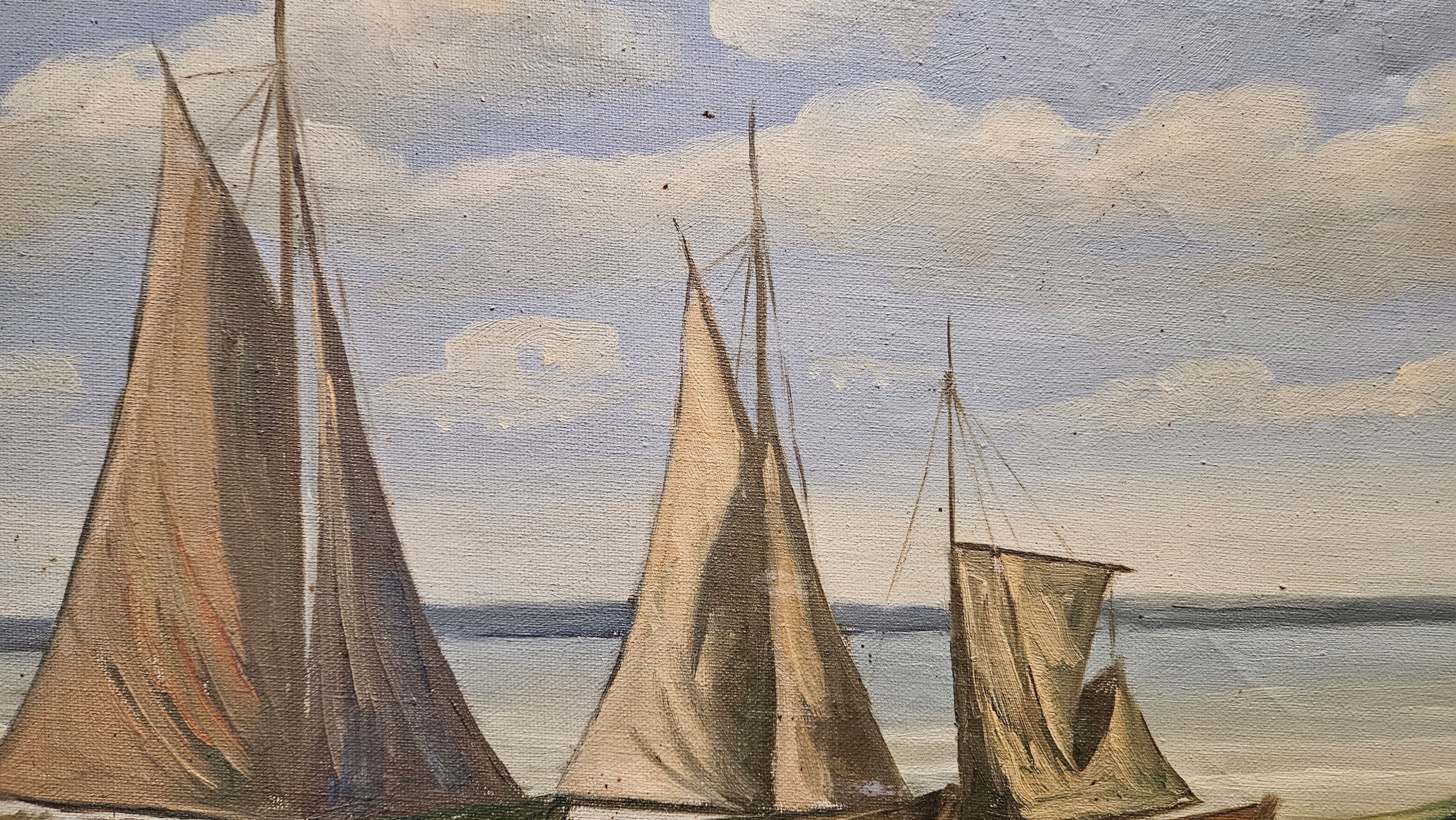 Предметом аукціону є оригінальна картина маслом із зображенням приморського пейзажу з рибальськими човнами та вітрильниками на фоні спокійного моря. Композиція витримана в реалістичному стилі, в стриманих природних кольорах. Картина в дуже хорошому стані, без дефектів, готова до повішування.