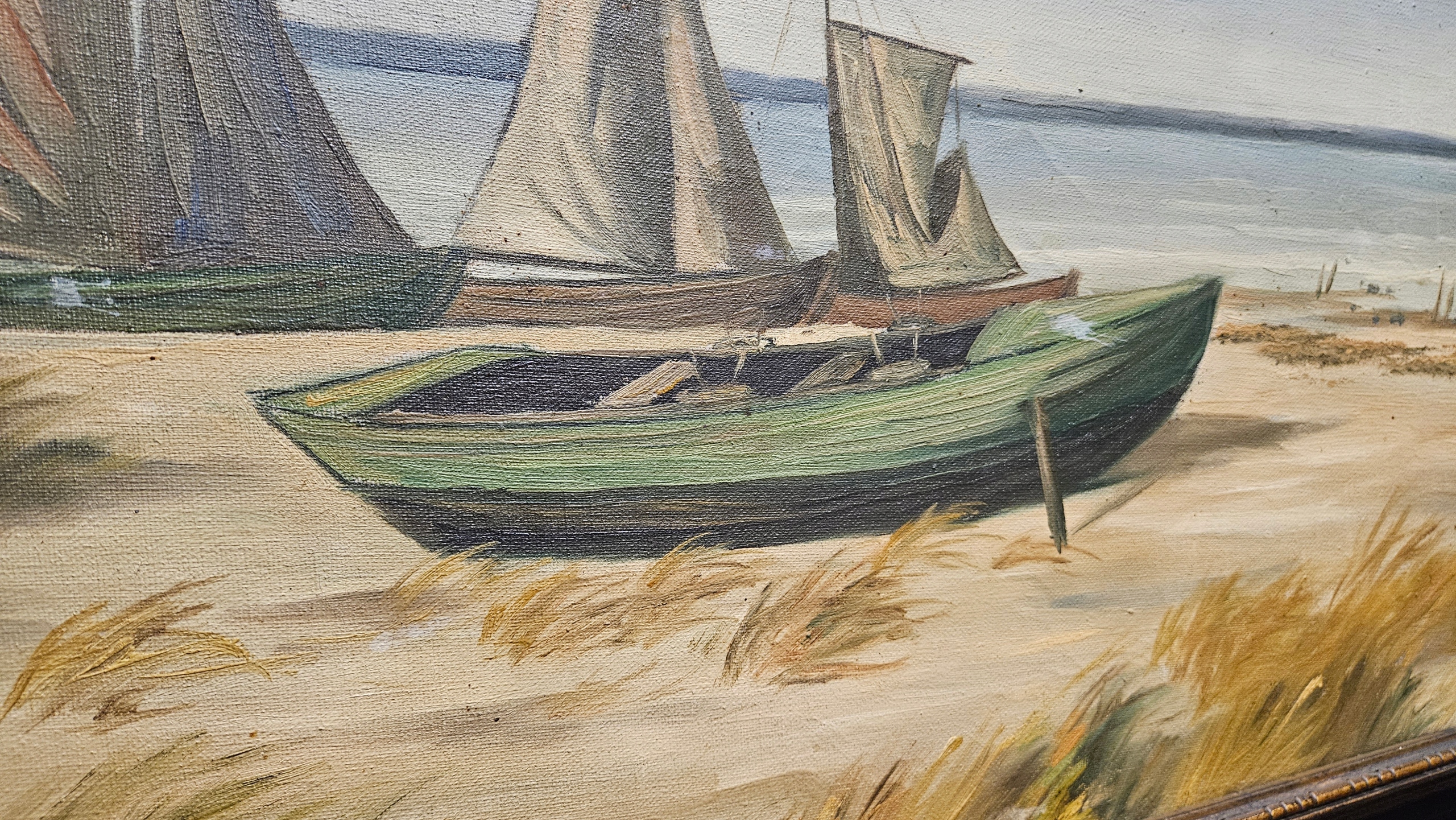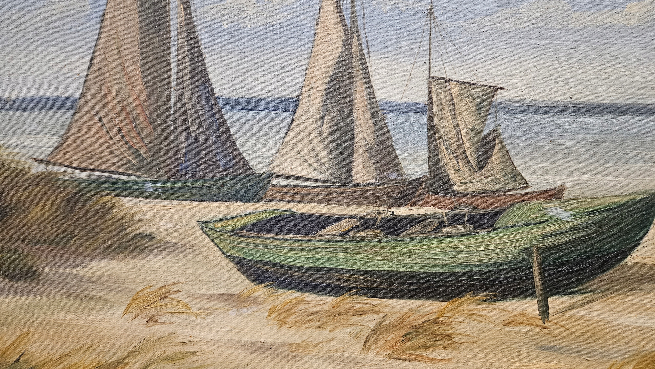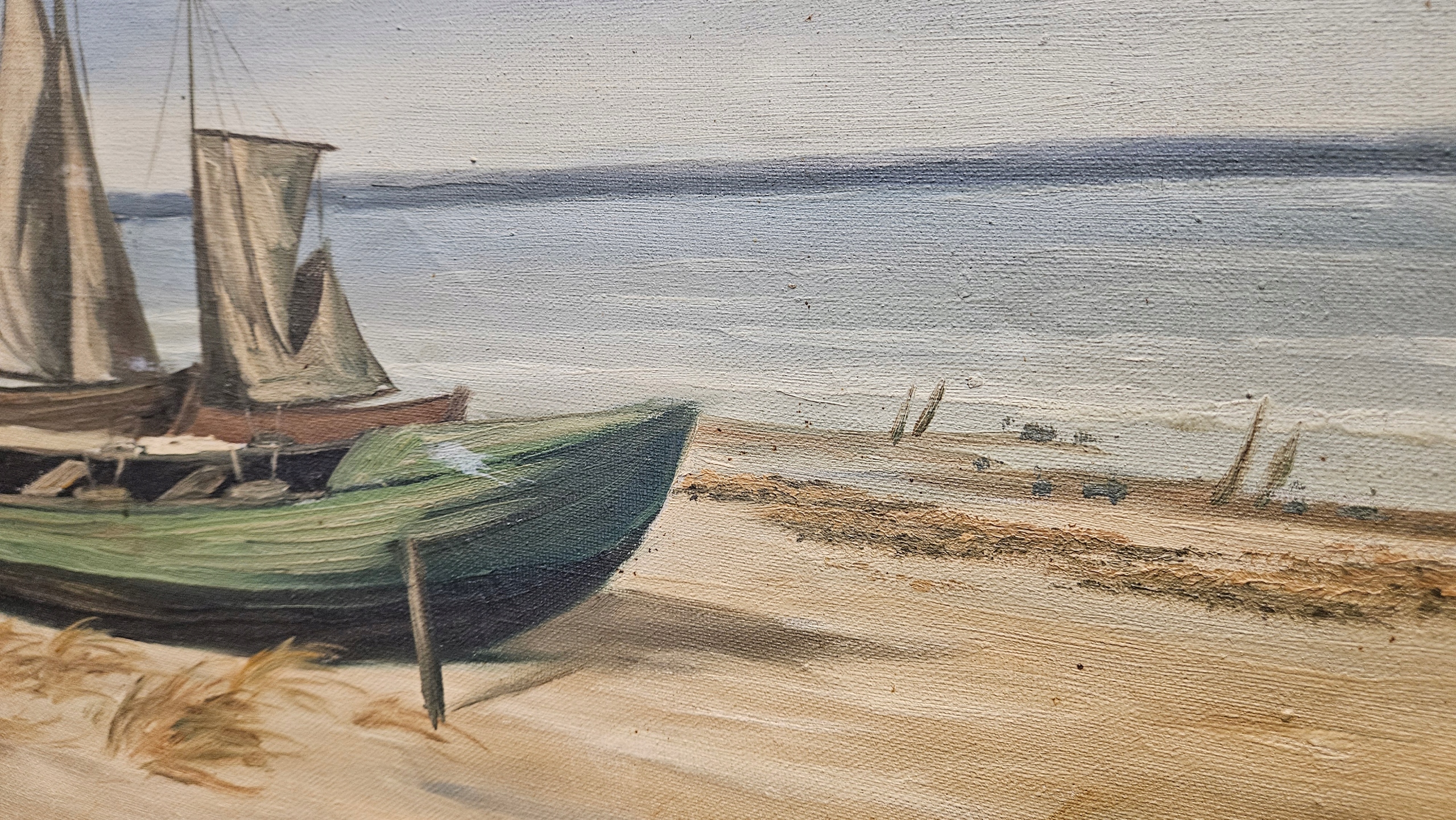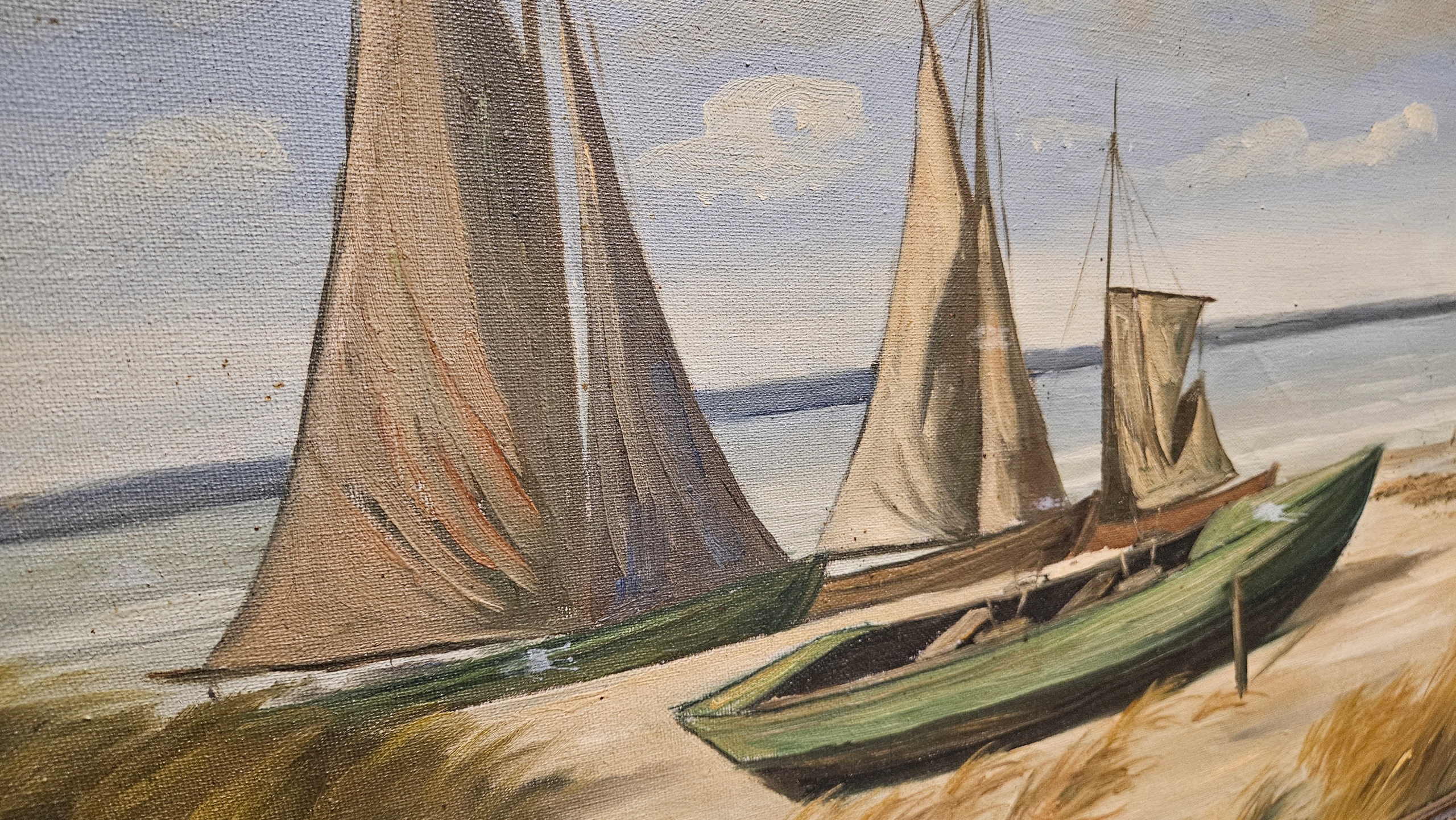 Вітрильники на пляжі - морські - олійний живопис, полотно, рама