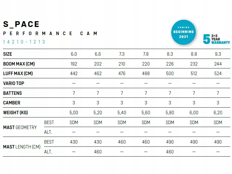 Низький натяг призводить до дуже жорсткої передньої шкаторини, високий натяг призводить до дуже помітного ослаблення передньої шкаторини. Дві надзвичайно віддалені MIN і MAX точки балансування доводять, що 3 IN 1 DESIGN охоплює неймовірно широкий діапазон вітру. Крім того, S_PACE має абсолютно різні характеристики та характер вітрил високого та низького класу, залежно від обробки. На МІНІМАЛЬНОМУ налаштуванні з щільною п’явкою supper ефективно накачує, дуже ефективно прискорюється та є неймовірно легким – також ідеально підходить для фольги. Однак у версії MAX Trim S_PACE дуже схожий на WARP, постійно прискорюється без обмежень. Три нові, регульовані по довжині HYPER CAM 2.0 забезпечують виняткову стійкість і стабільність профілю, а також плавне обертання.