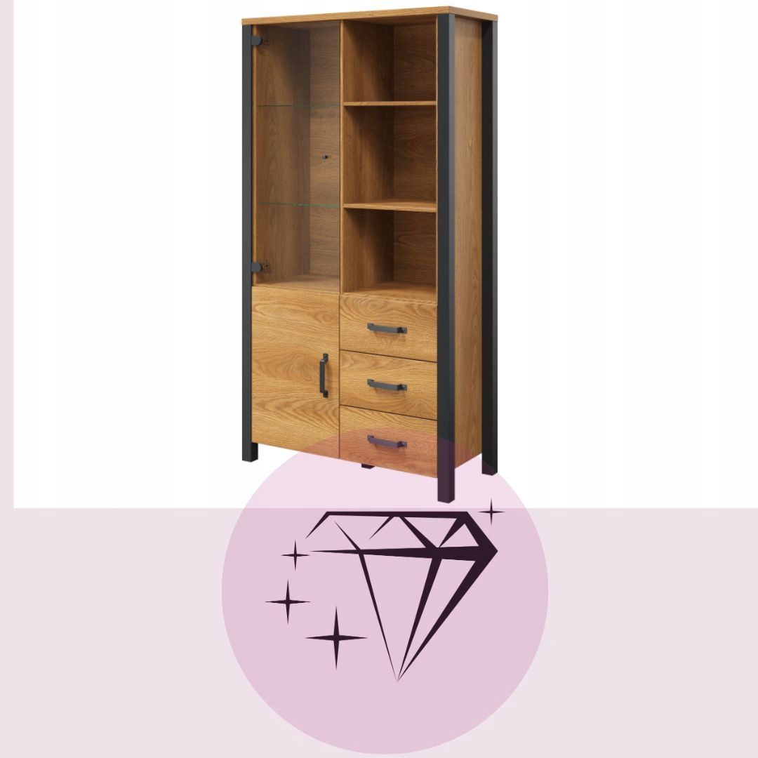 Шафа оснащена двома закритими фасадами, за якими розташовані місткі полиці. Скляна частина ідеально підходить для розміщення сімейних сувенірів або книг. Якщо ви любите органайзери, широкі полиці внизу меблів дозволяють вільно розмістити їх у вигляді контейнерів або швидкозшивачів для документів. Додатковий простір для зберігання включає три місткі полиці, де можна легко сховати дрібні речі.