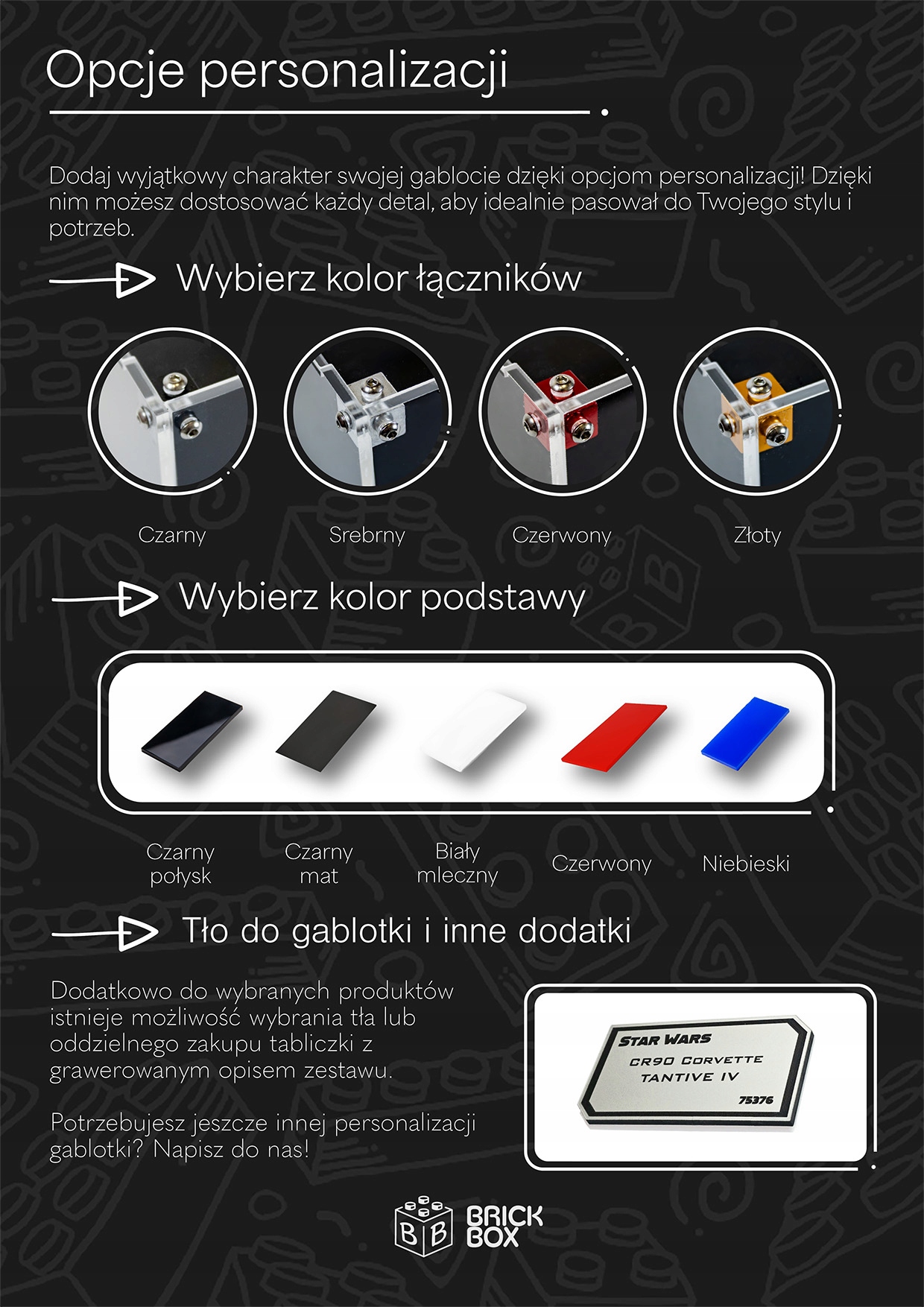- Колір з'єднувачів (срібло, чорний, червоний або червоний або Złto) Наша пропозиція, яку ви знайдете фон для дисплея , яку ви можете придбати на інших аукціонах. Ви можете придбати фон окремо та легко встановити його на раніше придбаному чохол.