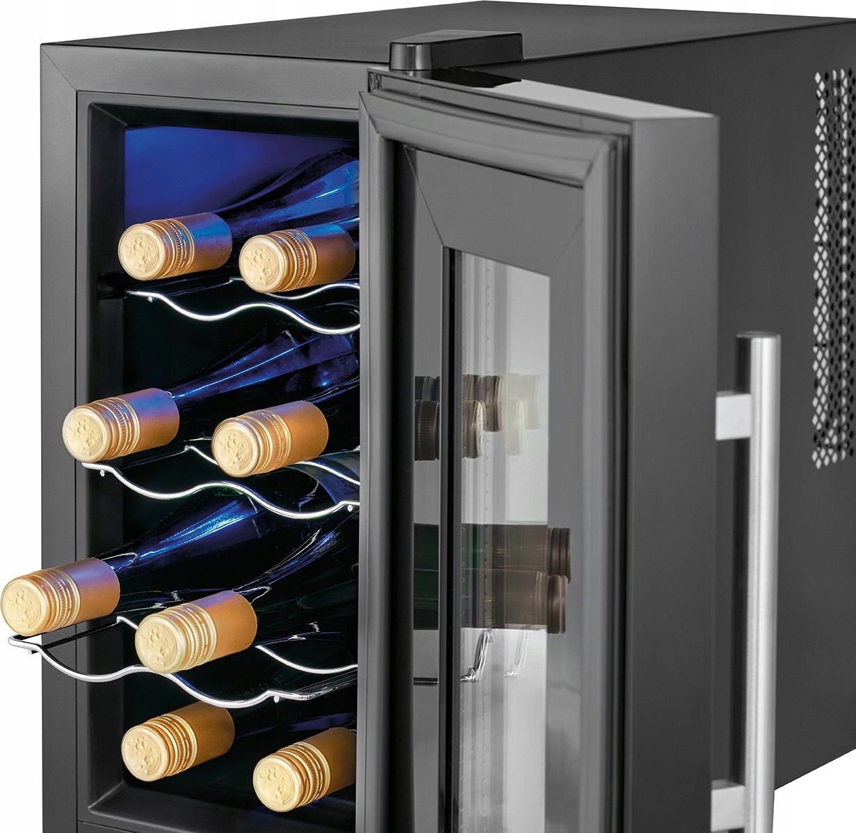 Чотири заокруглені хромовані полиці вміщають 8 пляшок вина ємністю 0,75 л. Загальний об'єм холодильника становить 23 літри.