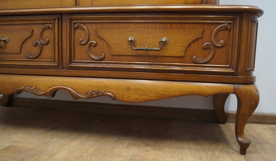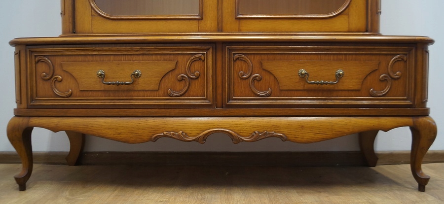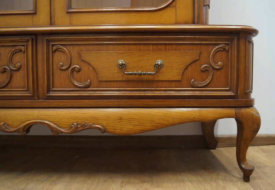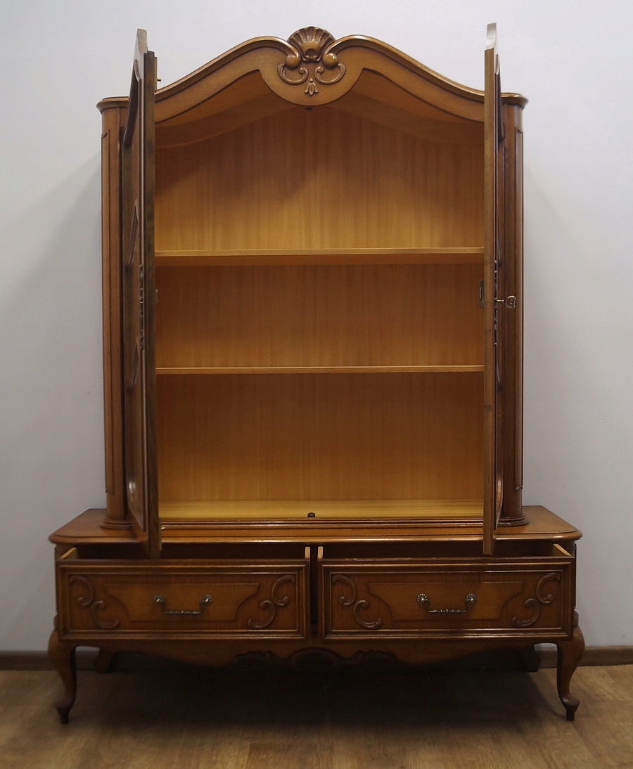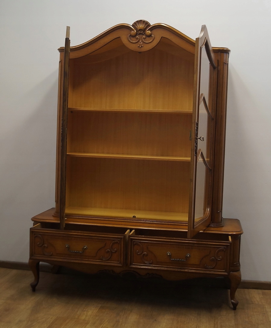 Вгорі дві двері засклені, вікна, прикрашені стовпами, завершальна арочна форма, завершена різьбленою раковиною. Під дверцятами є ящики. Вітрина прикрашена чудовим різьбленням і спирається на красиві ніжки кабріоля. Низ оброблений декоративним воланом. Красиві різьблені елементи роблять цей предмет меблів унікальним та особливим.