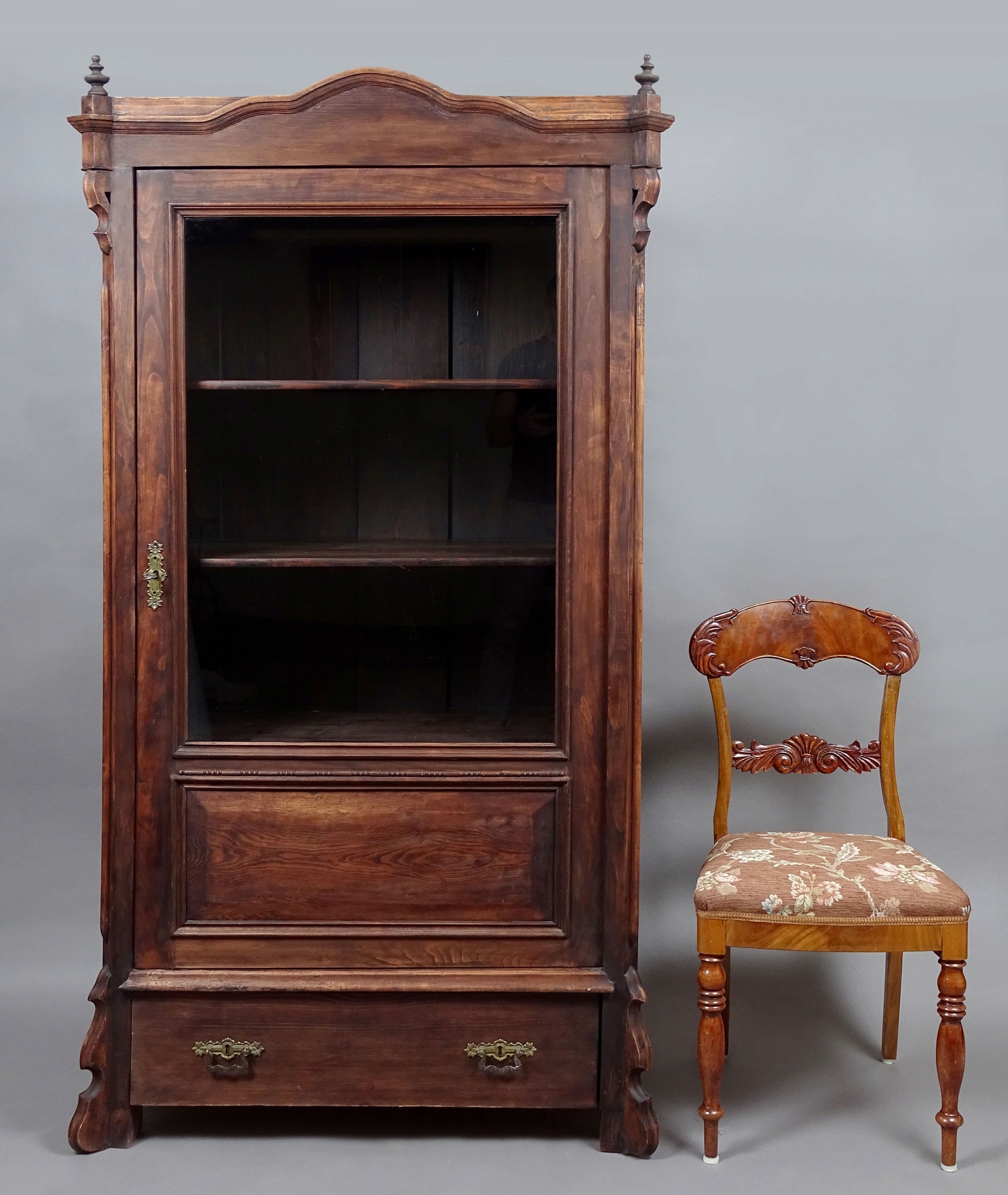 закривається одними скляними дверцятами, з похилими передніми кутами, з шухлядою внизу. Спирається на чотири кутасті масивні ніжки, спереду з різьбленими прикрасами. Двері внизу мають повну панель, оточену тонкою смугою, зі сталевим врізним замком і ключем, а також латунну фурнітуру. Така ж пара ящиків поруч із ящиком. Зверху злегка хвиляста смужка, а з боків дві вершини. Всередині три стійкі дерев'яні полиці.
