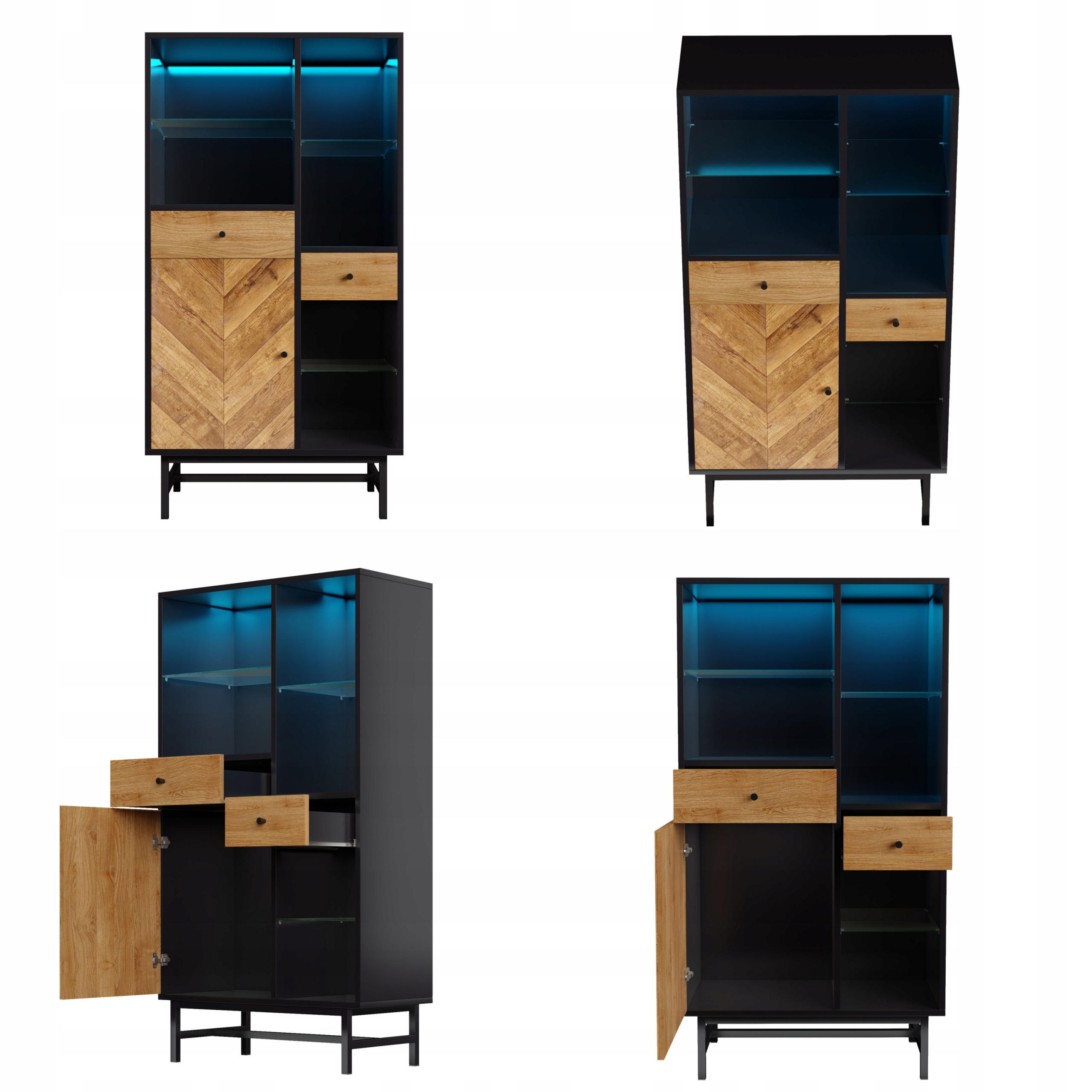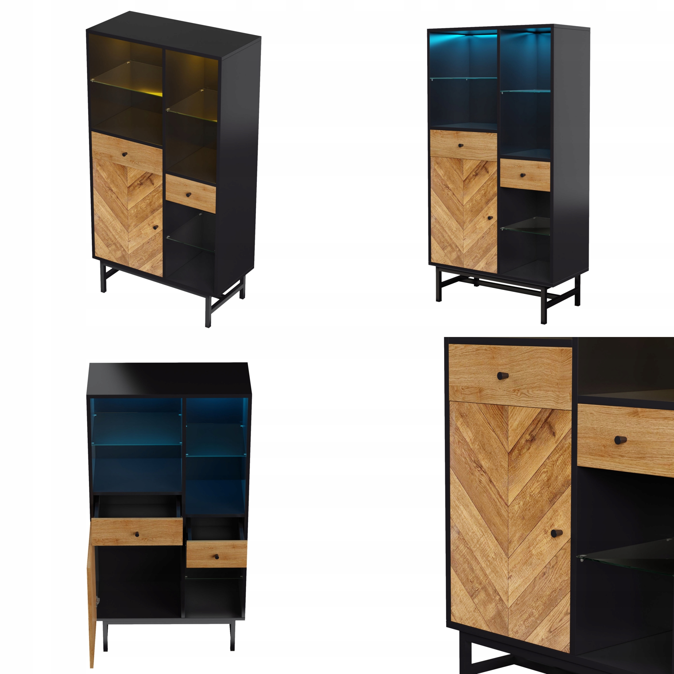 Вітрина, шафа-вітрина з 12-кольоровою світлодіодною стрічкою, кухонна шафа з висувними ящиками та скляними полицями, трикутна текстура дерева
