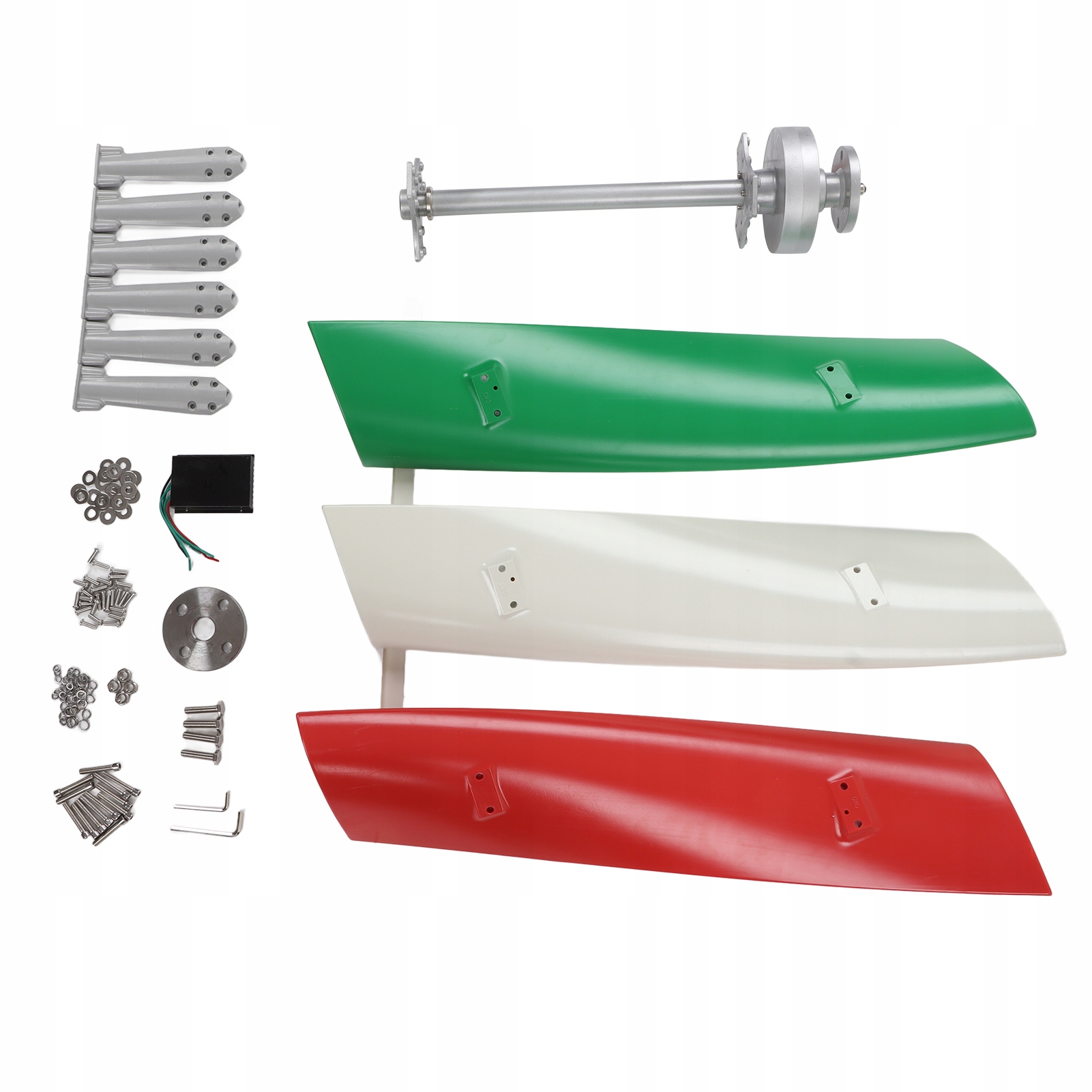 1. GFRP 3 Blade: Вітрогенератор має 3 лопаті (білі, червоні, зелені), які мають аеродинамічну форму та виготовлені з GFRP, завдяки чому ротор працює плавно, надійно та тихо.