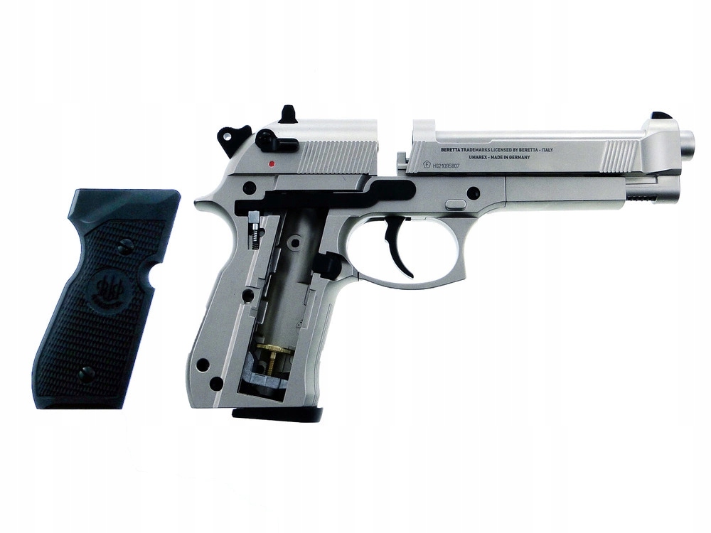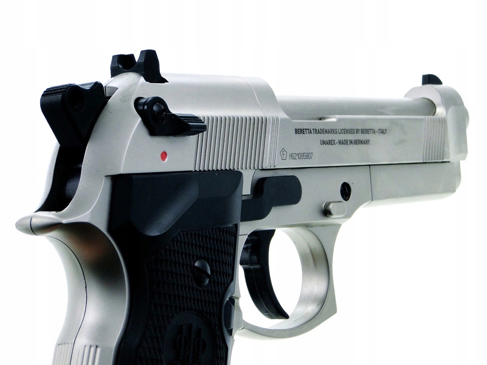 Beretta M92 FS нікель 4,5 мм Diabolo CO2 — це приваблива пневматична зброя з металевою конструкцією, оснащена нарізним стволом, ударно-спусковим механізмом SA/DA, двостороннім запобіжником і текстурованими накладками.