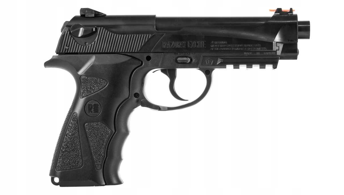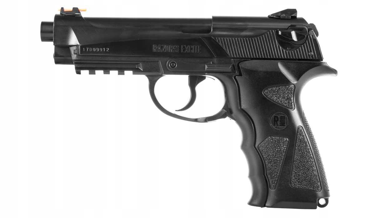 Пневматичний пістолет RazorGun Excite – це пістолет, повністю виготовлений із міцного полімеру під назвою ABS. Створено за зразком культової вогнепальної зброї Beretta 90 TWO калібру 9 мм.