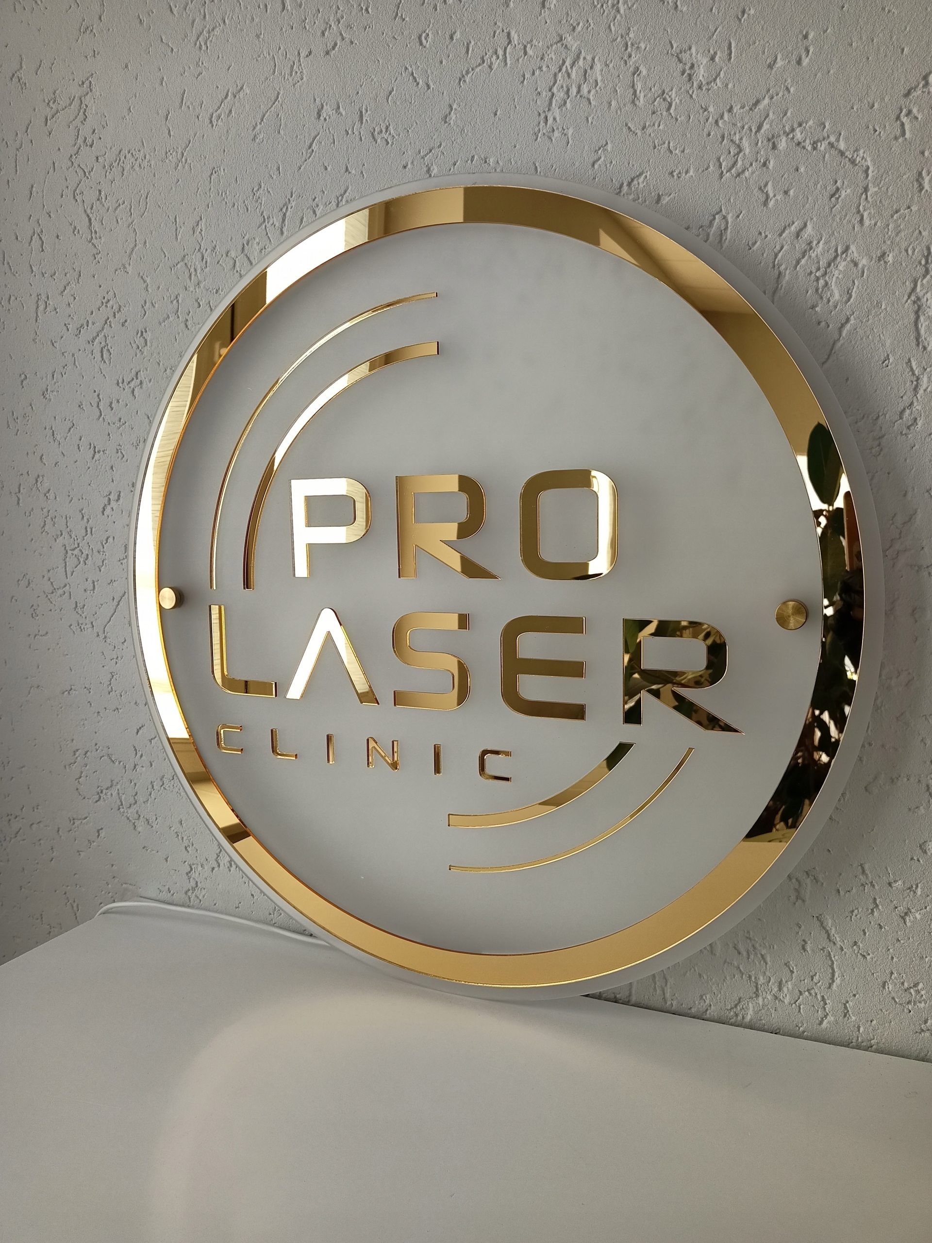 Вивіска виготовлена з матової основи з оргскла. (напівпрозорий), а написи та логотип виконані кольоровим або дзеркальним (золото, срібло, рожеве золото) акрилом.