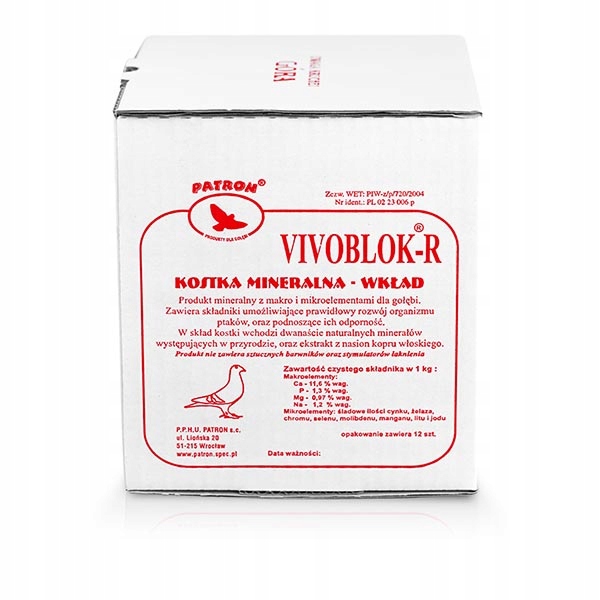 Кубики VIVOBLOK-R та VIVOBLOK-W, які охоче поїдаються голубами та багаті макро та мікроелементами, упаковані в привабливі упаковки по три штуки. кожного типу, створюючи мінеральну СУМІШ. Таким чином, продукт стає більш привабливим для заводчика.
