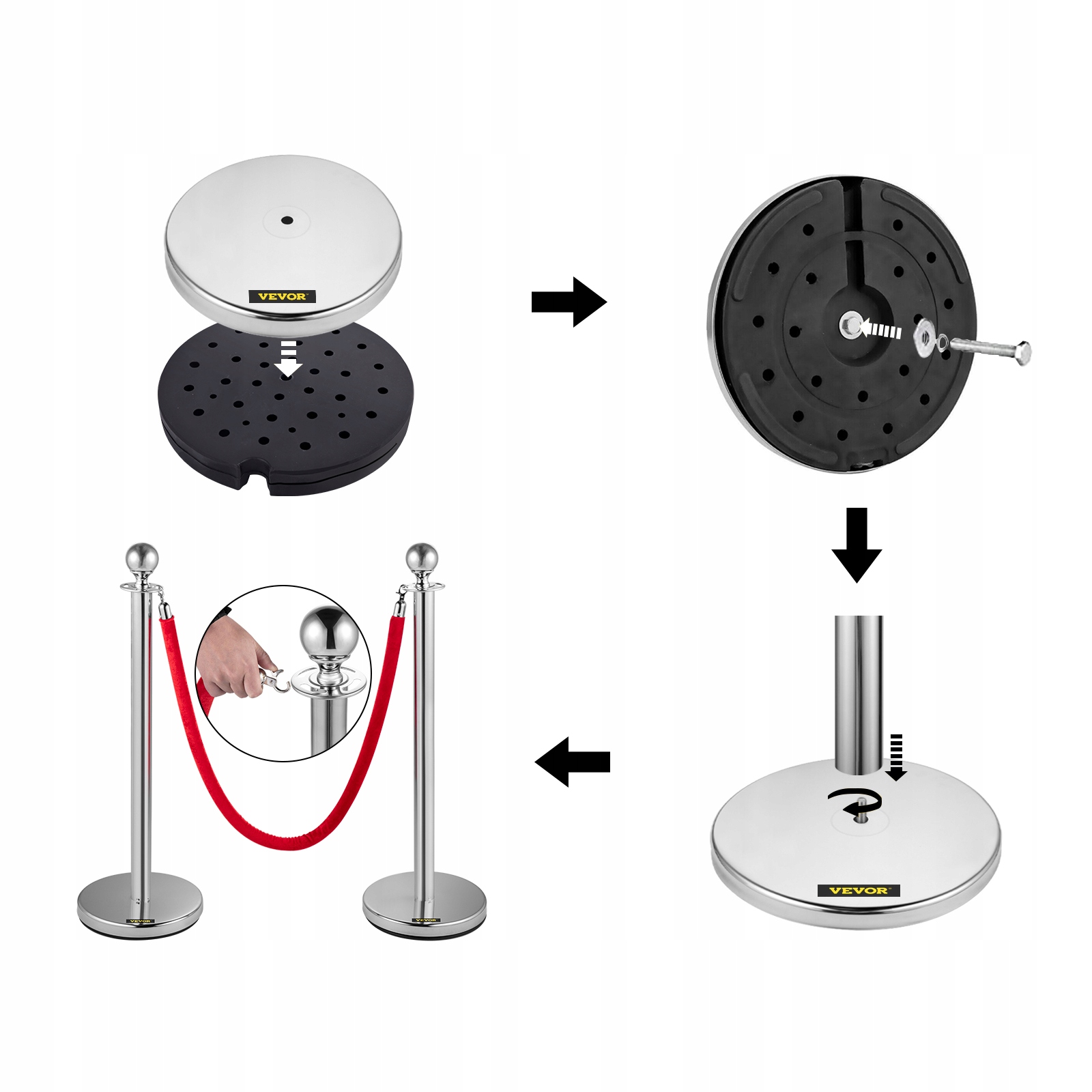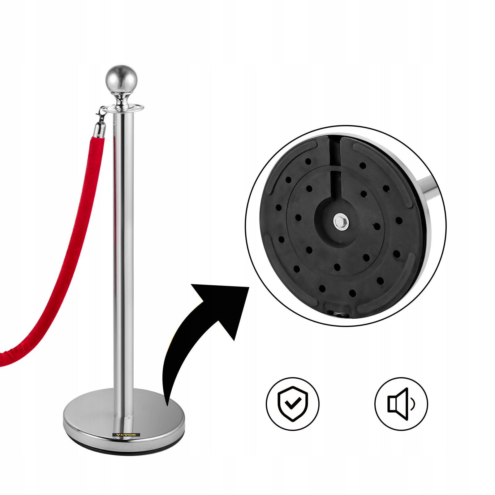 Ця черга використовується для управління натовпами або розділення місця для різних функцій. Конструкція з нержавіючої сталі та міцні оксамитові струни забезпечують використання тривалого використання. Суцільна основа забезпечує стабільність. Її елегантний та сучасний дизайн робить його придатним для різних випадків та місць, таких як театри, ресторани, кінофестивалі, музеї, заходи на червоній доріжці тощо.